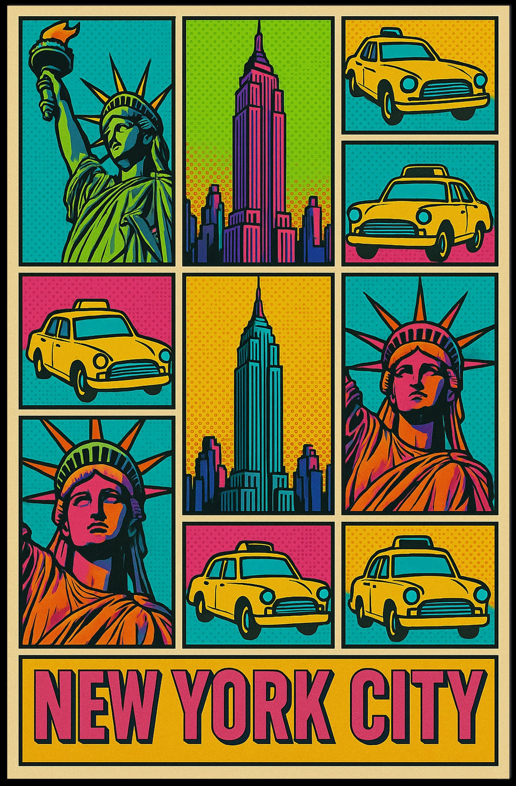 Experience the vibrant energy of New York City with this striking pop art poster. Featuring iconic symbols like the Statue of Liberty, yellow taxis, and the Empire State Building, this design captures the city's dynamic essence in a vivid, Andy Warhol-inspired palette that instantly enlivens any space.
