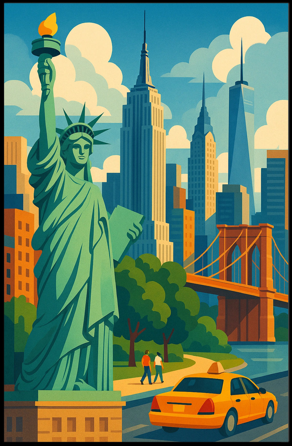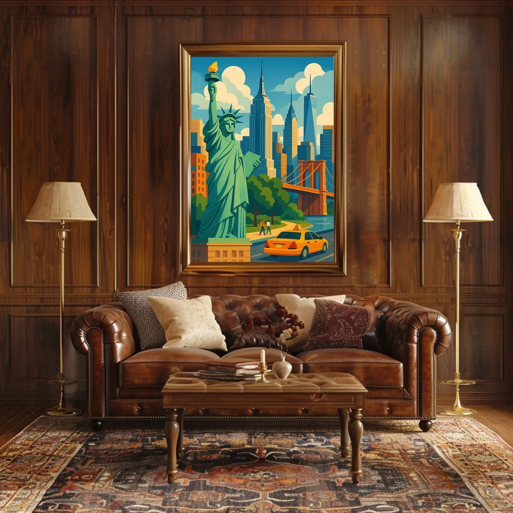 Experience the vibrant energy of New York City with this retro-modern art poster. The iconic Statue of Liberty stands proudly in the foreground, symbolizing freedom and American identity, while the skyline behind features the Empire State Building and One World Trade Center, delivering bold urban character. This print blends vintage charm with contemporary design, making it a striking centerpiece for any living room, office, or hallway.