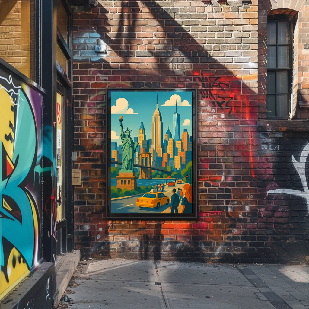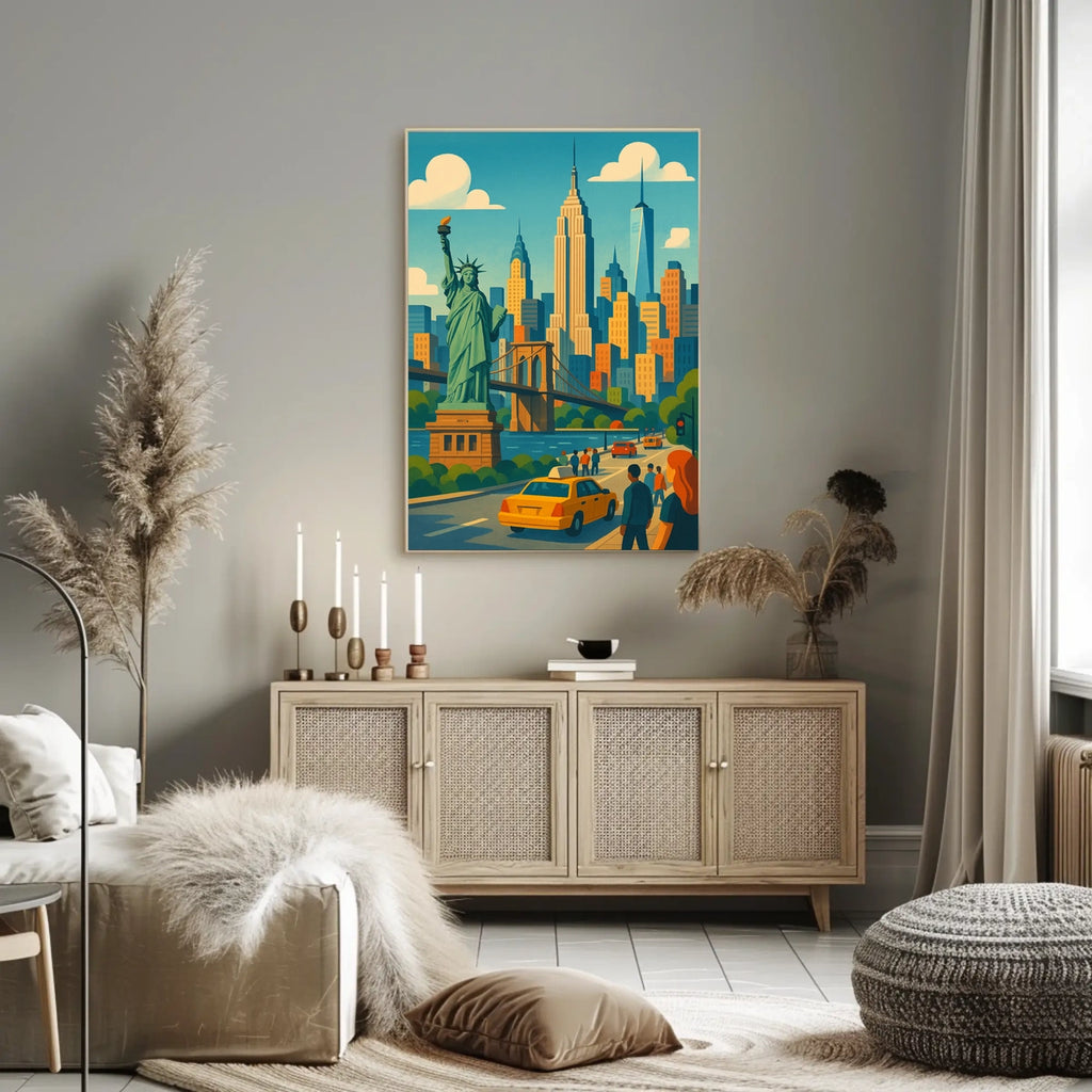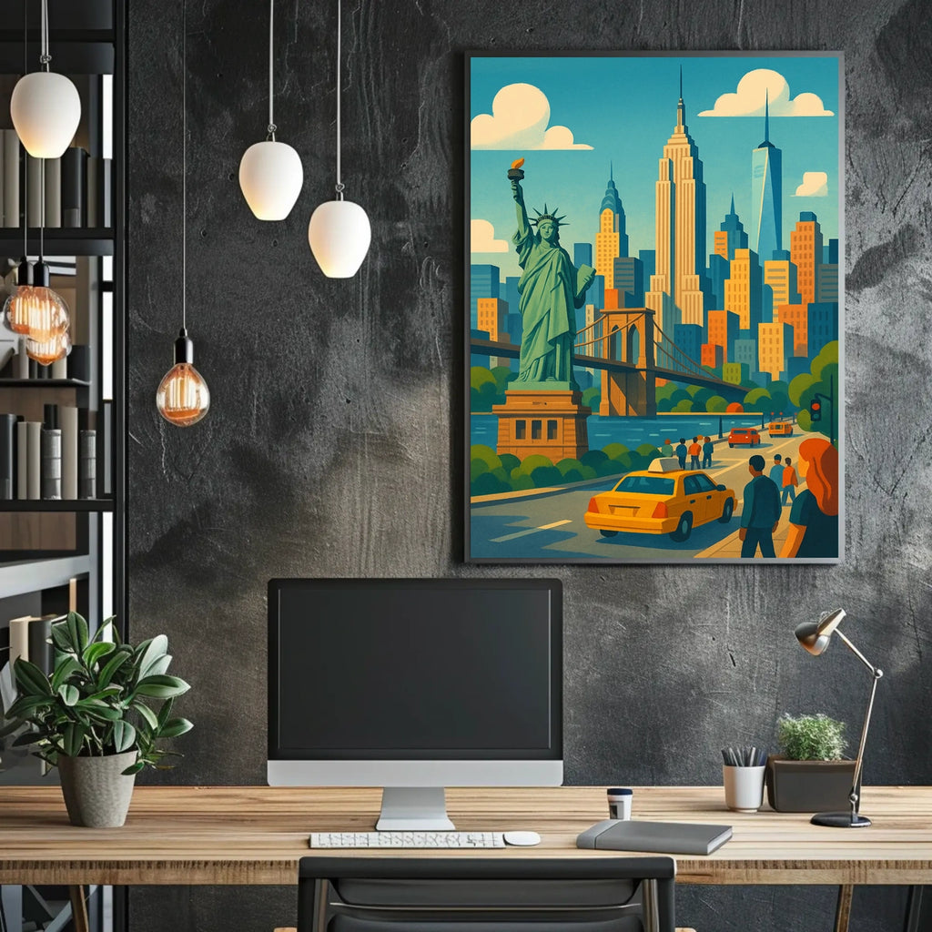 Immerse yourself in the vibrant energy of New York City with this striking poster. It features a stylized Statue of Liberty foreground against a bold, retro skyline, delivering timeless urban charm and a modern flat design that elevates any space.