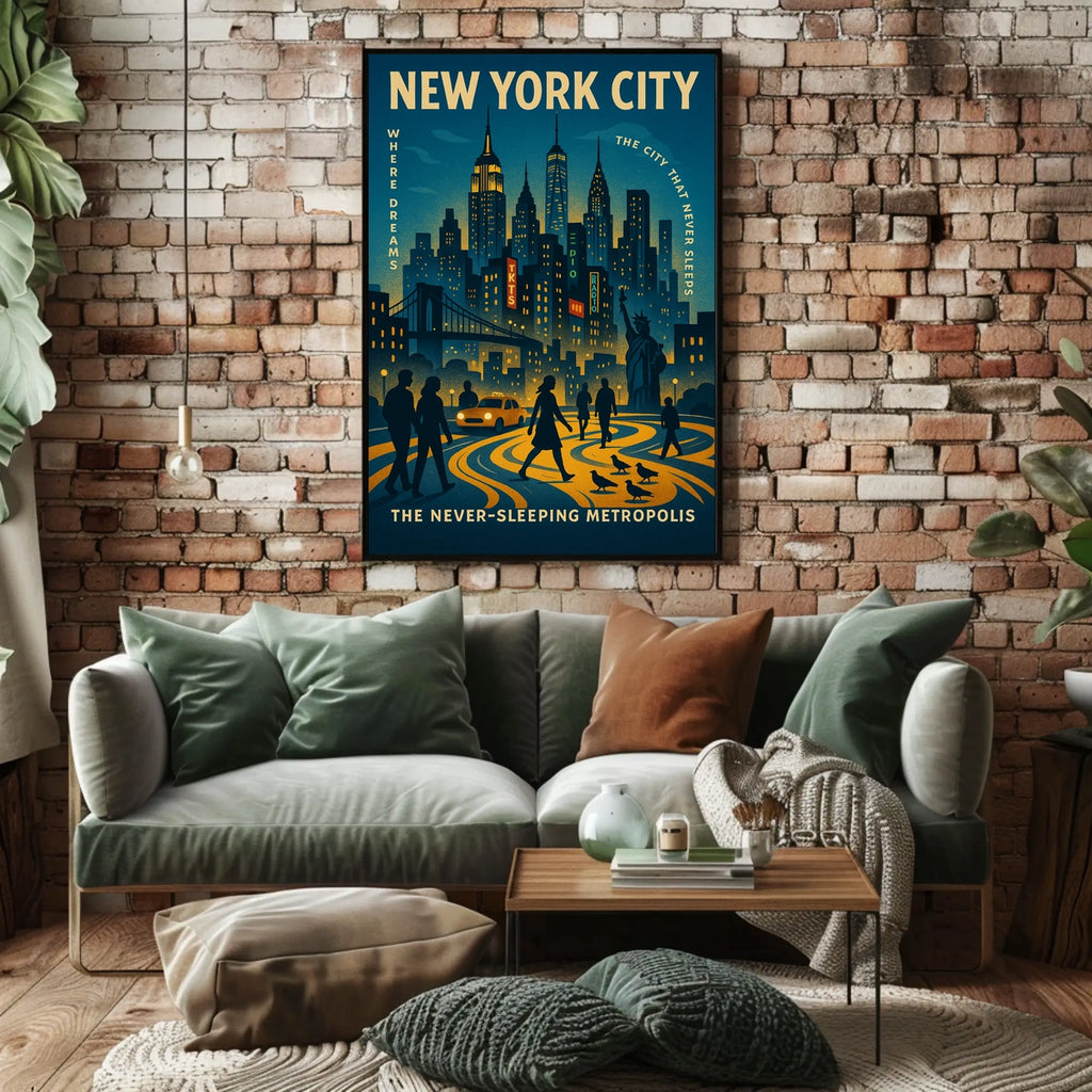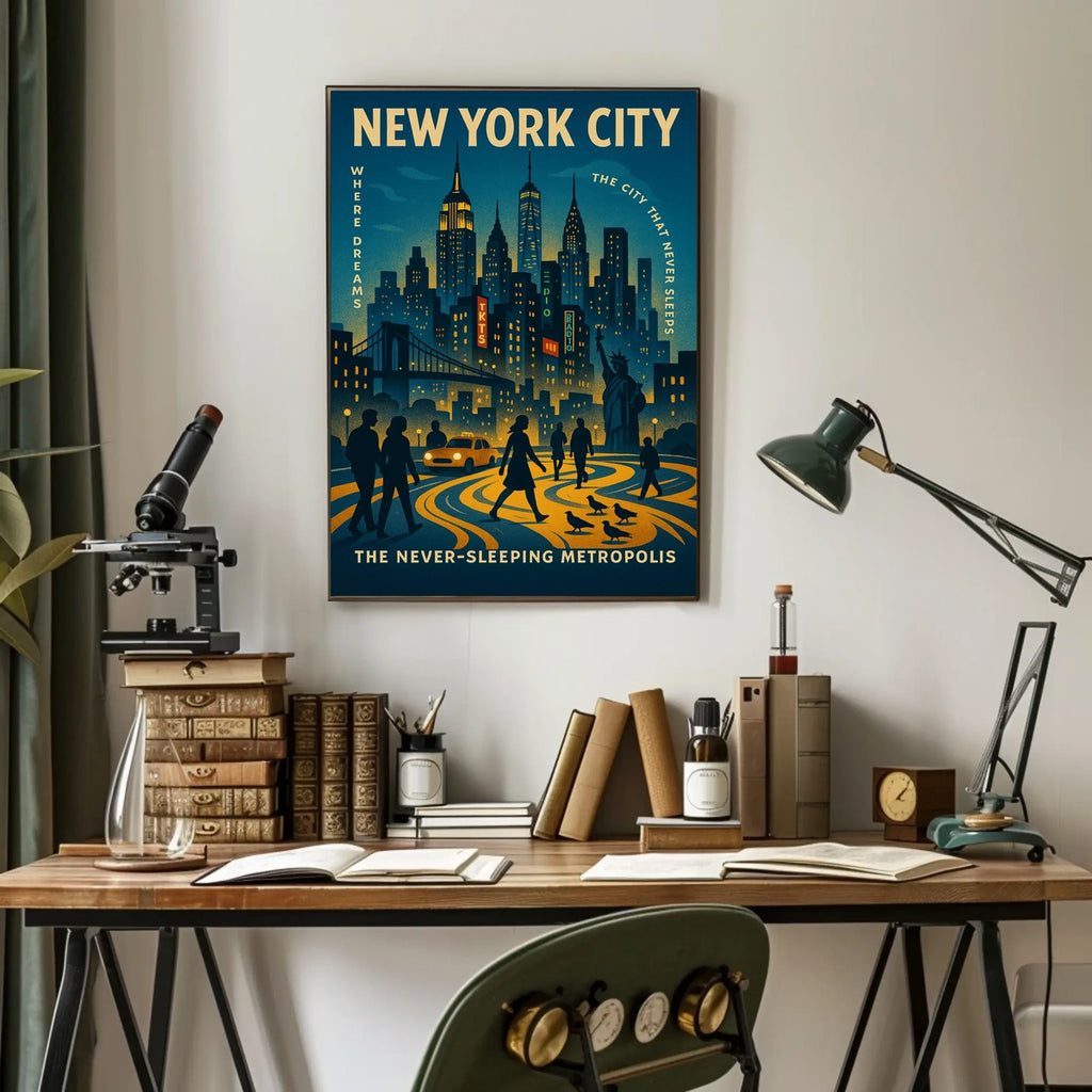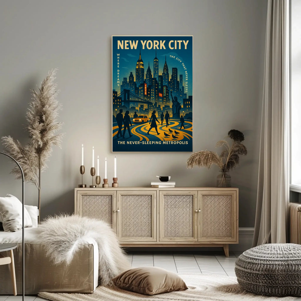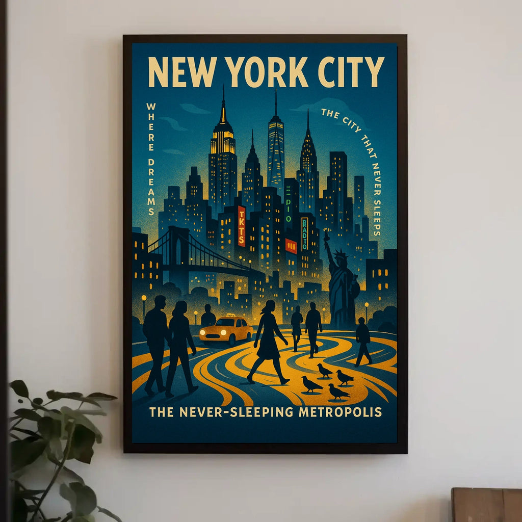 Experience the vibrant energy of New York City with this striking retro-style poster. Its clean lines, nostalgic hues, and silhouettes of a bustling street capture the spirit of the city that never sleeps, turning any wall into a lively travel-forward statement.