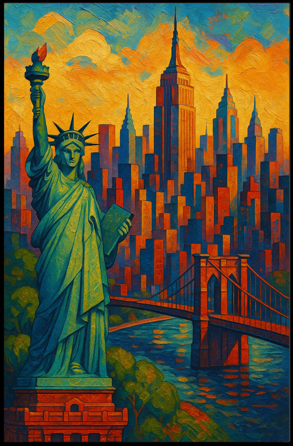 - Iconic NYC landmarks in vibrant impressionism — dynamic brushstrokes bring the Statue of Liberty and Empire State Building to life, creating an instant focal point that sparks conversation.
