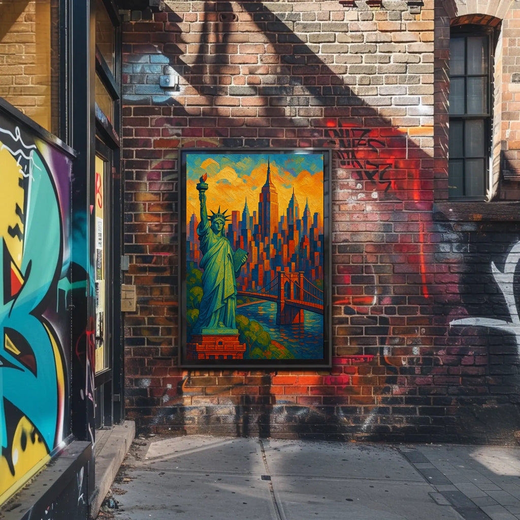 Intro: Experience the vibrant essence of New York City with this stunning art poster. The artwork captures the Statue of Liberty in the foreground with a majestic Empire State Building skyline, rendered in expressive, impressionistic brushstrokes that celebrate urban energy and timeless landmarks.