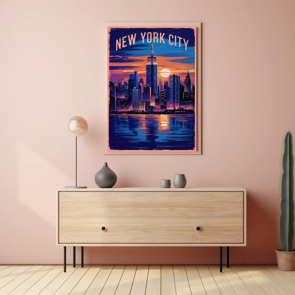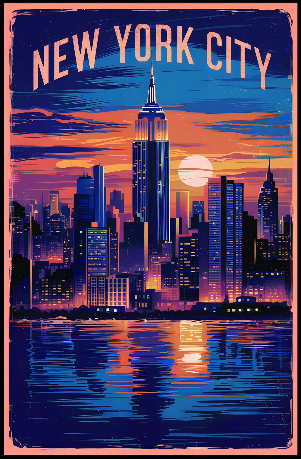 Bring the magic of Manhattan home with the New York City Skyline at Sunset Poster by PosterGoat — a vibrant pop art travel poster that captures the city’s iconic skyline, reflective waterfront, and a glowing sunset in bold, nostalgic hues.