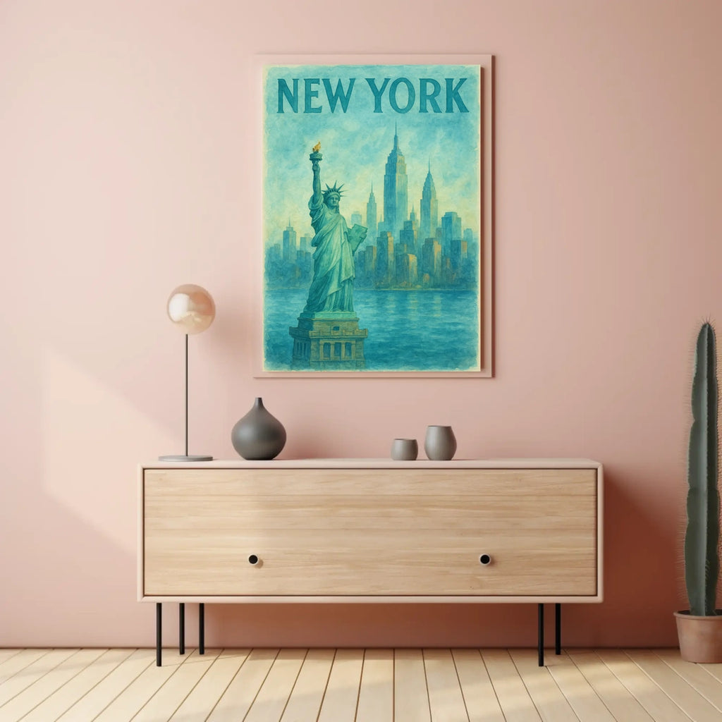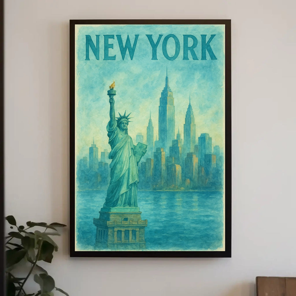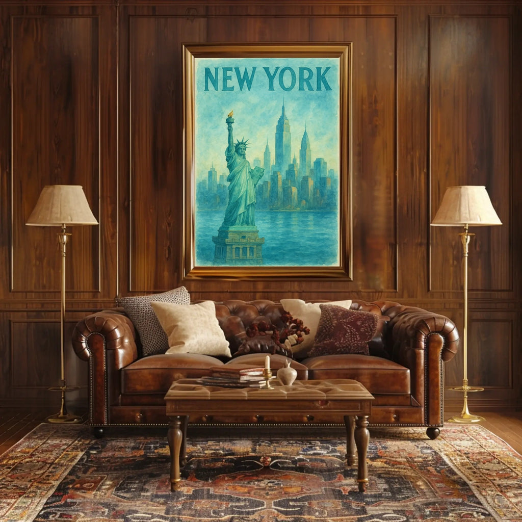 - Detailed design highlighting iconic NYC landmarks and skyline silhouettes