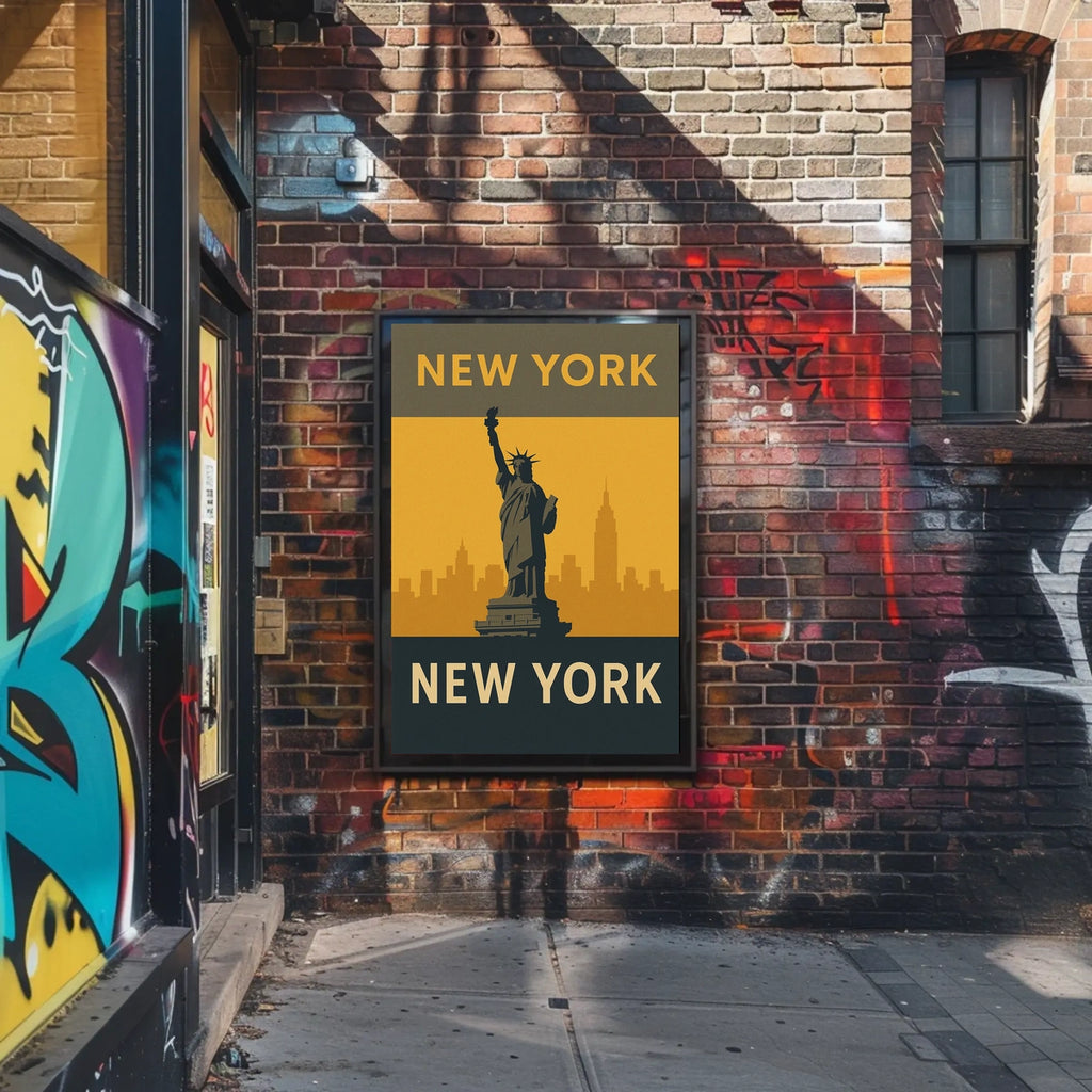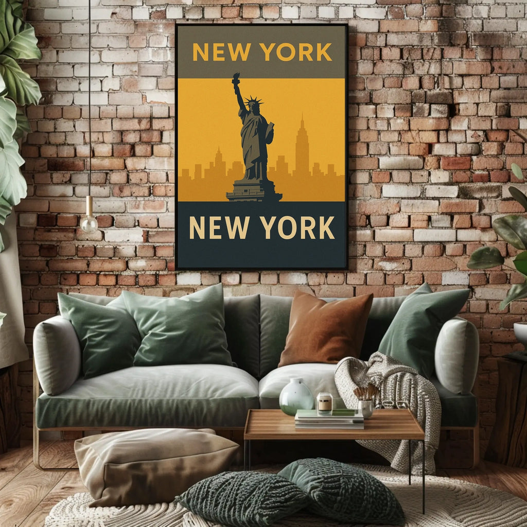 Experience the grandeur of New York City with this striking vintage poster print. Showcasing the Statue of Liberty amid a bold, stylized skyline, it blends nostalgic charm with modern graphic flair. The warm yellow, orange, and black palette adds dramatic impact to any space.