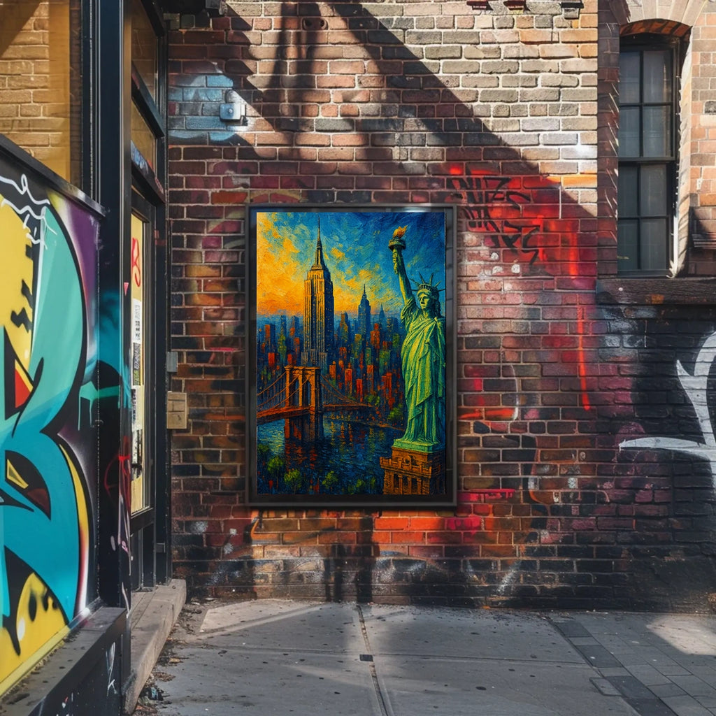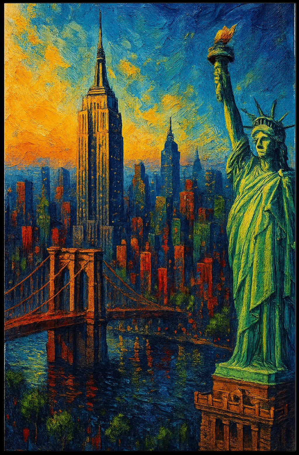 Experience the electric energy of New York City at golden hour with this Sunset Impressionism Art Poster. The skyline glows in a painterly blend of oranges, blues, and yellows, highlighting iconic landmarks like the Statue of Liberty, the Empire State Building, and the Brooklyn Bridge. This piece adds drama, warmth, and a touch of urban romance to any space.