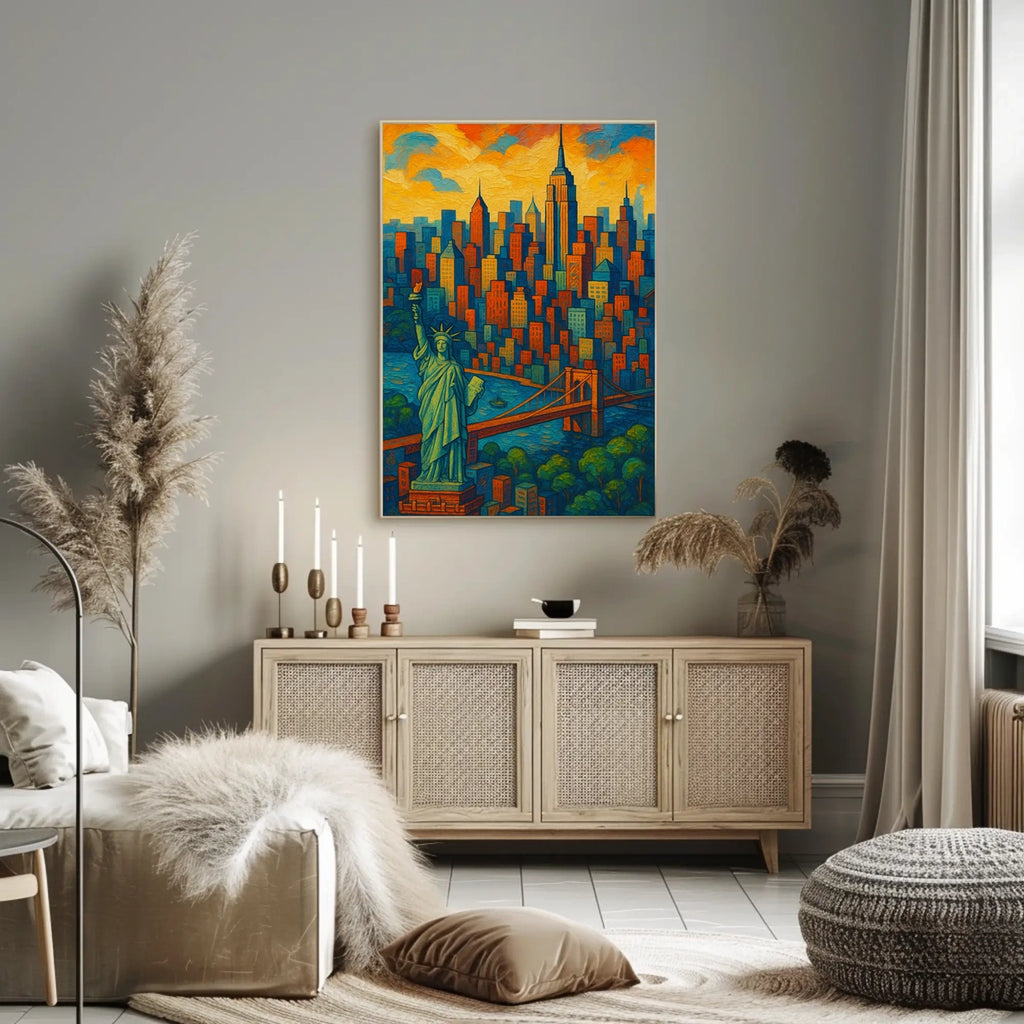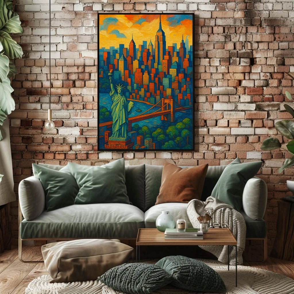 Transport your space to the heart of Manhattan with this vibrant skyline poster. The dramatic portrayal centers the Statue of Liberty against a bold, colorful cityscape, while a stylized Empire State Building and a Brooklyn Bridge-inspired arc add urban flair and timeless charm.