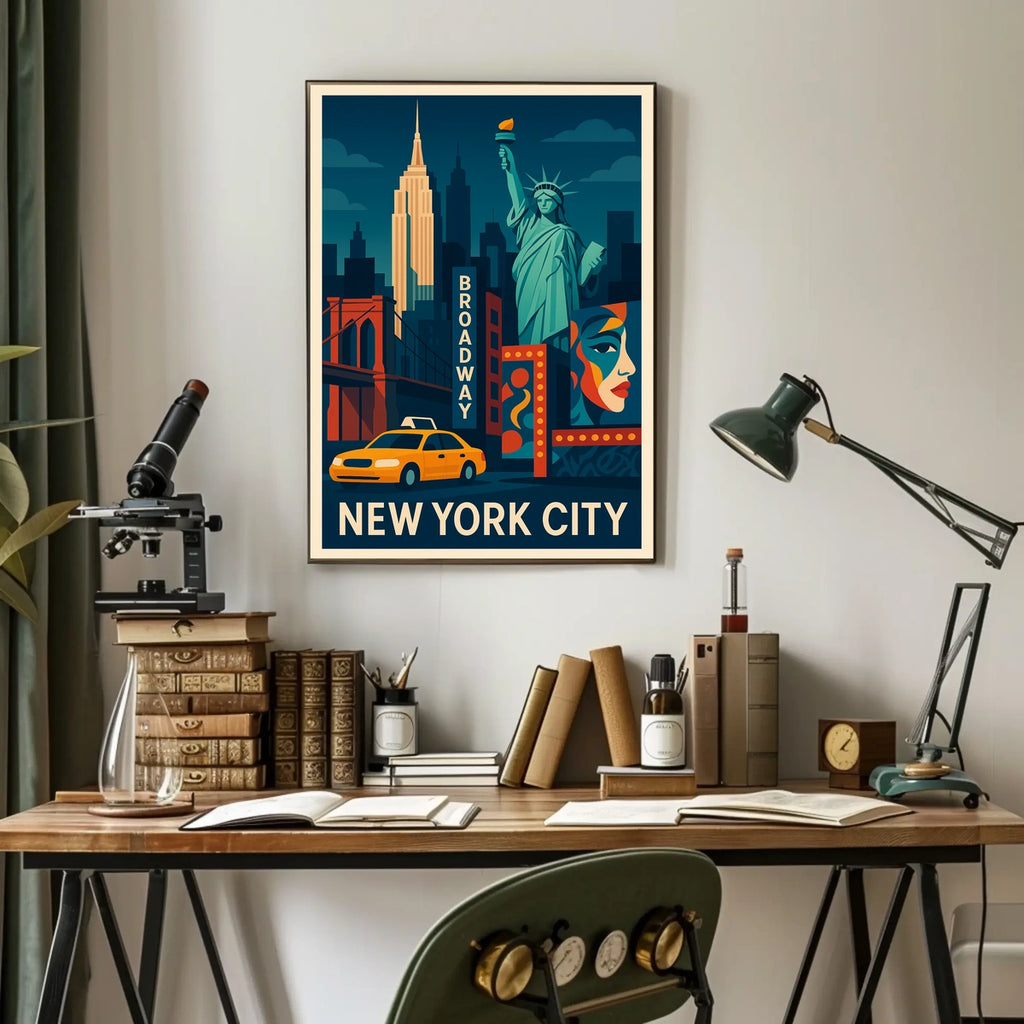 Immerse yourself in the dynamic energy of New York City with this vibrant urban art poster. Designed to evoke the city's heartbeat, it features iconic landmarks—the Statue of Liberty, Empire State Building, and Brooklyn Bridge—alongside a bright yellow taxi and Broadway-inspired accents that capture the bustling spirit of NYC.