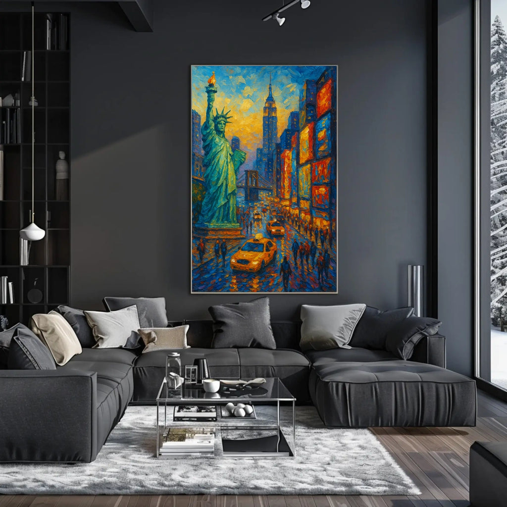 Immerse yourself in the electric energy of New York City with this impressionistic poster. Featuring the Statue of Liberty and the Empire State Building, it captures bustling streets, yellow taxis, and lively crowds—bringing urban life, cultural flair, and travel-ready style to any space.