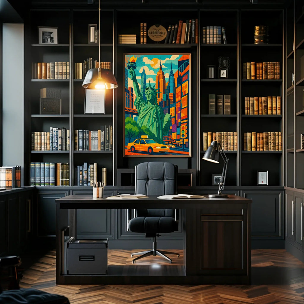 Immerse yourself in the vibrant energy of New York City with this vibrant Vintage Poster Art Print. Featuring the Statue of Liberty, iconic skyscrapers like the Empire State Building and Chrysler Building, and the quintessential yellow taxi, this poster captures the metropolis’s dynamic, cosmopolitan spirit—perfect for modern vintage decor and NYC wall art lovers.