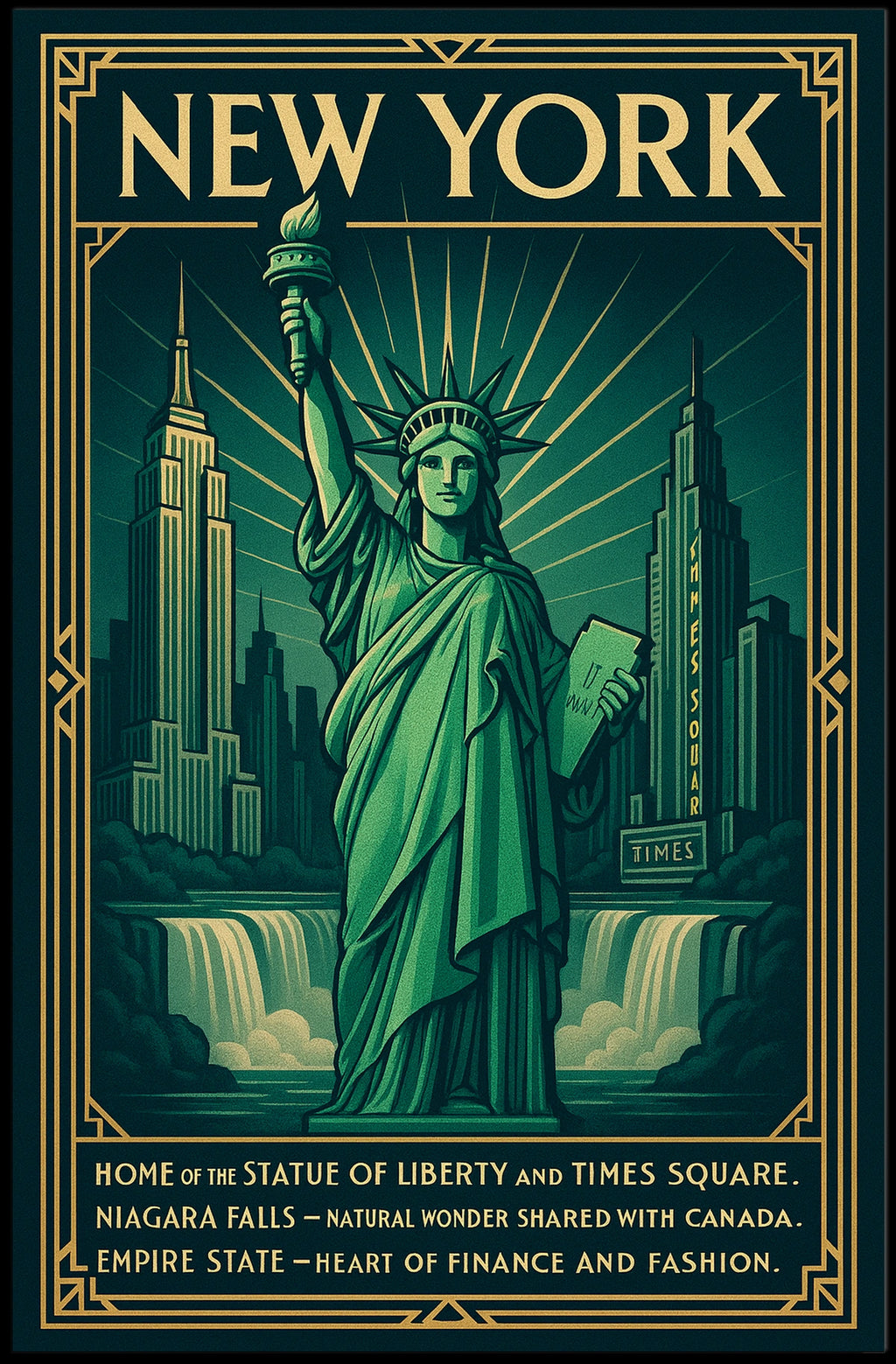 Intro: Immerse your space in the grandeur of New York City with a striking vintage Art Deco travel poster. Centered on the Statue of Liberty, it distills the city’s energy into bold, elegant imagery that appeals to fans of travel, history, and classic design.