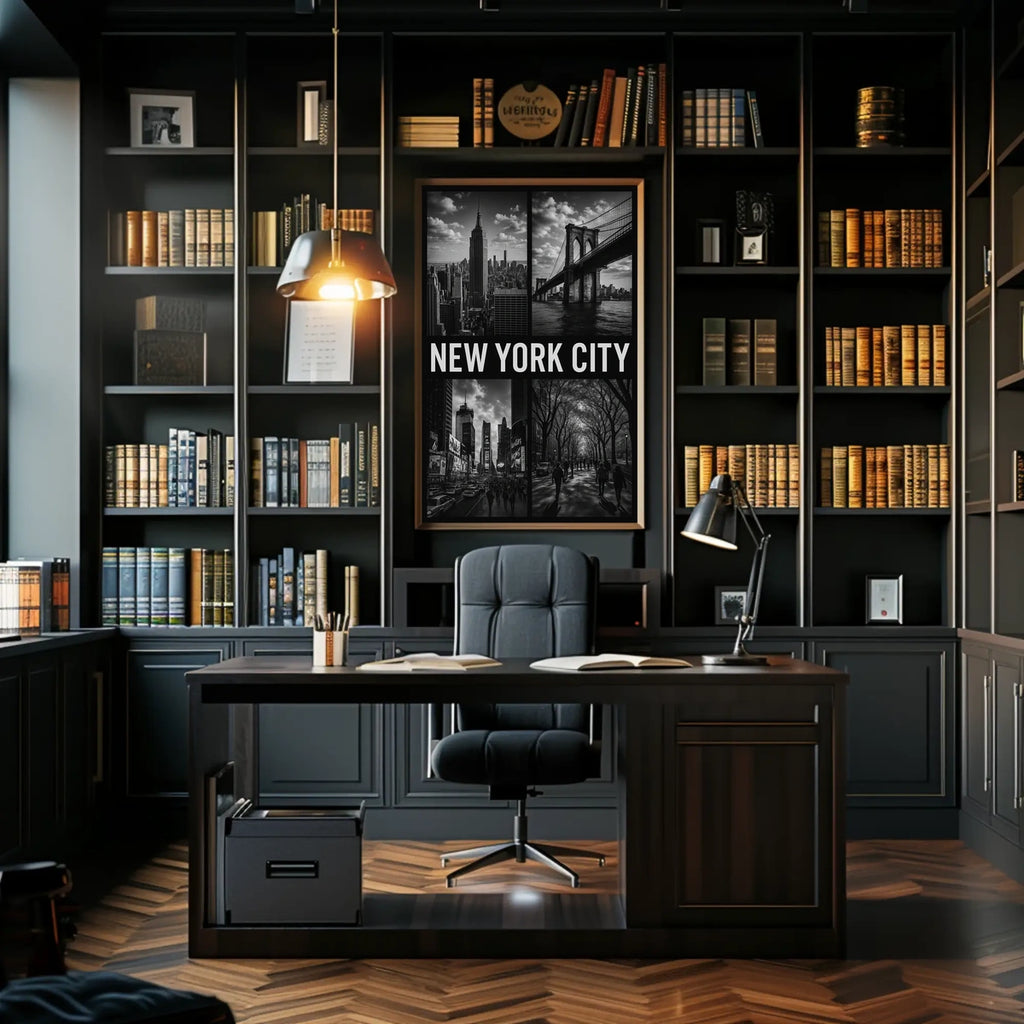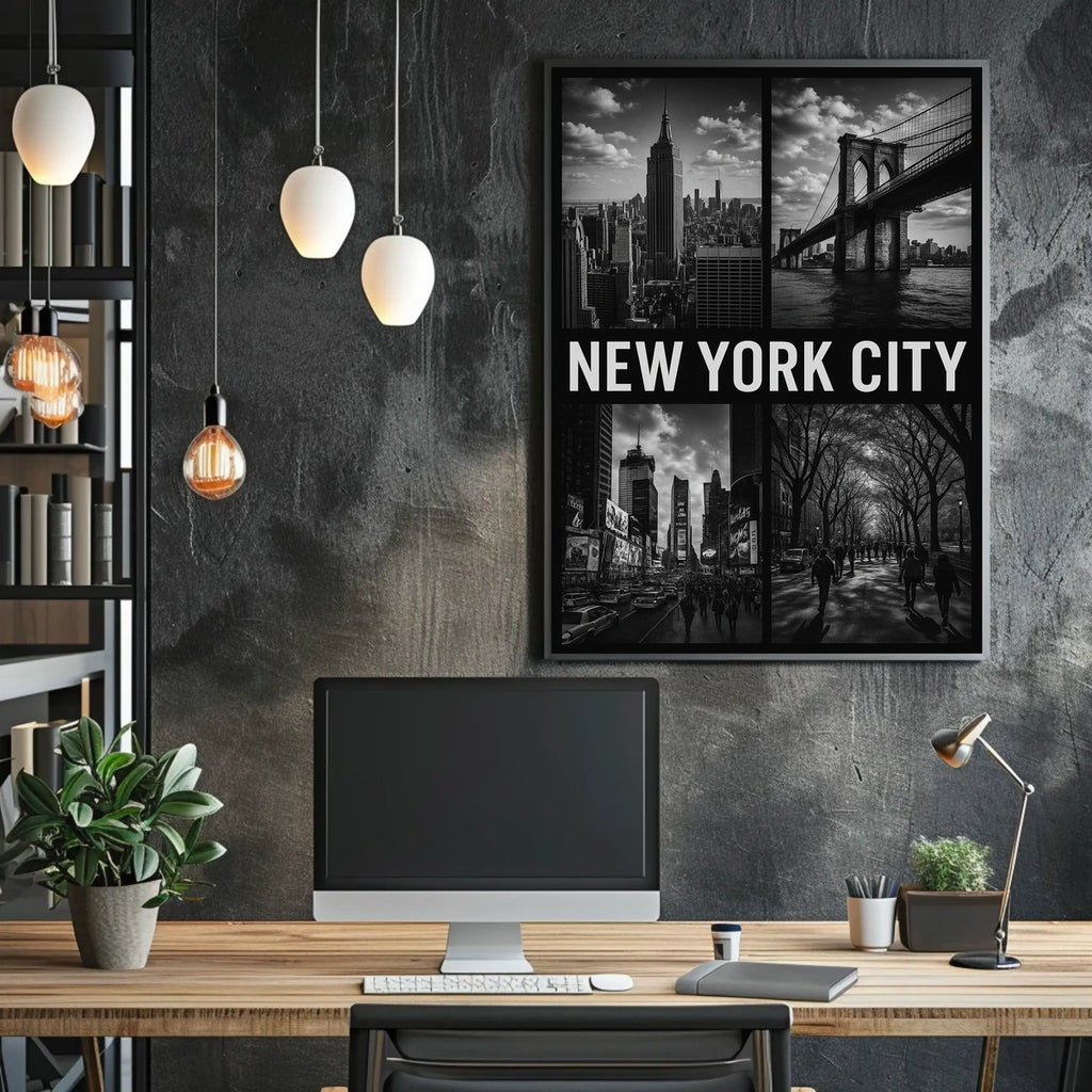 Immerse yourself in the timeless allure of New York City with this black-and-white poster. Featuring four iconic scenes, the Empire State Building rises above the skyline while the Brooklyn Bridge frames the horizon—capturing the city’s bold energy in a refined monochrome palette. Perfect for living rooms, offices, or dorms, it adds classic charm and a versatile backdrop to any decor.