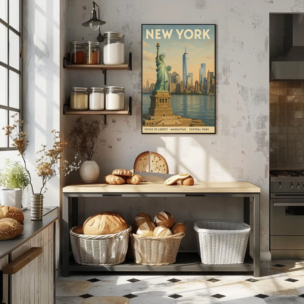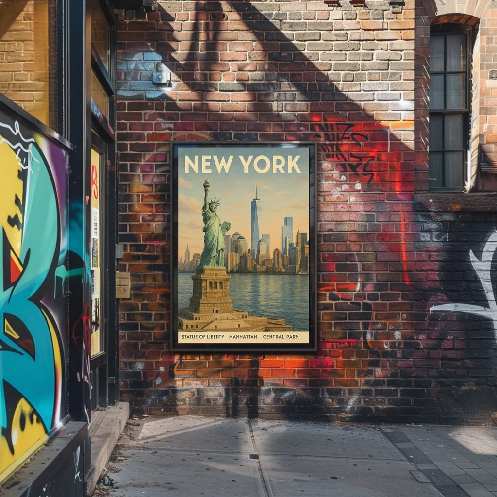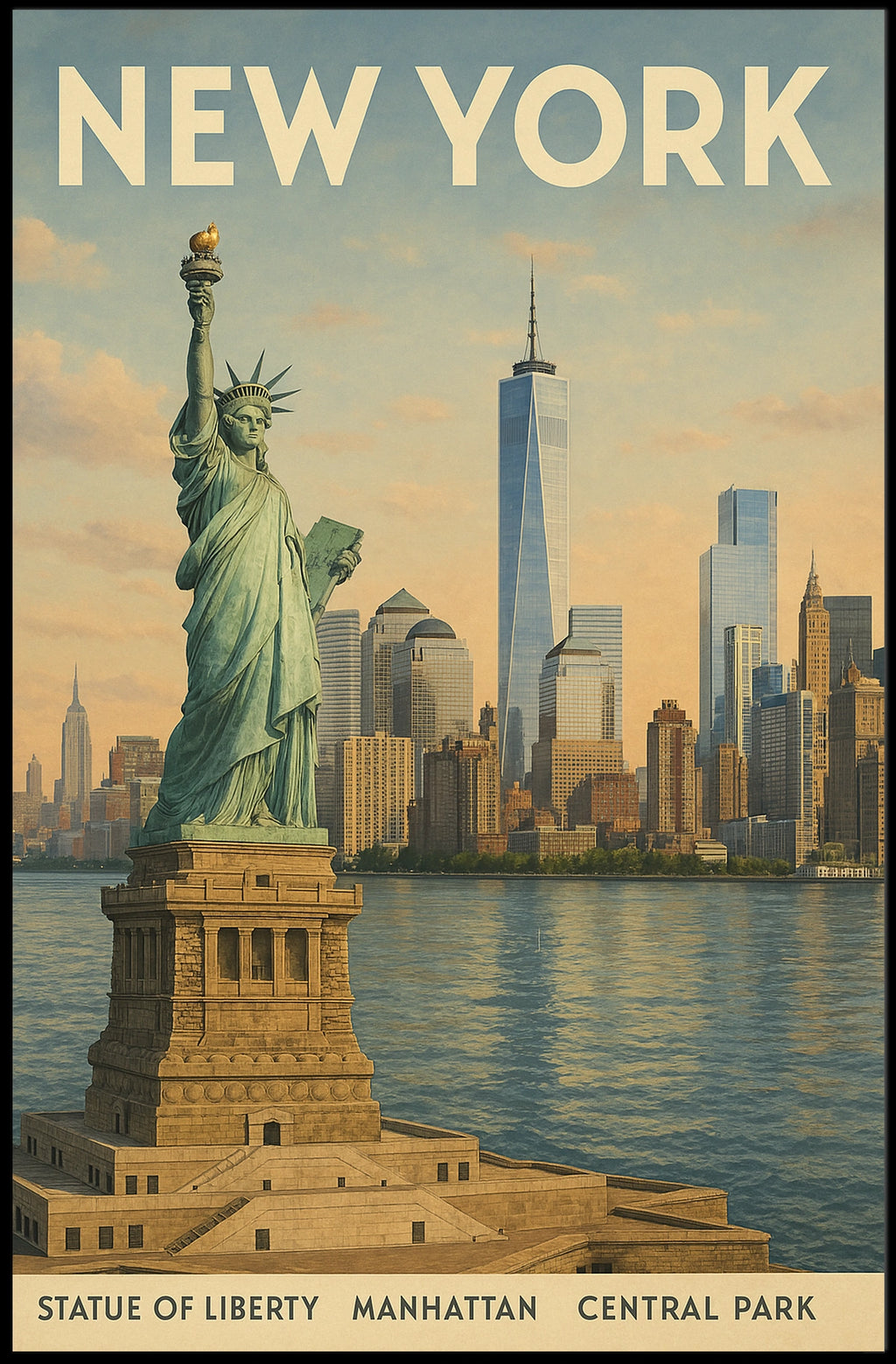 Celebrate the architectural grandeur and historical spirit of New York City with this vintage-inspired poster. Featuring the Statue of Liberty in the foreground and the majestic Manhattan skyline, including One World Trade Center, it blends patriotism with nostalgia to elevate any space.
