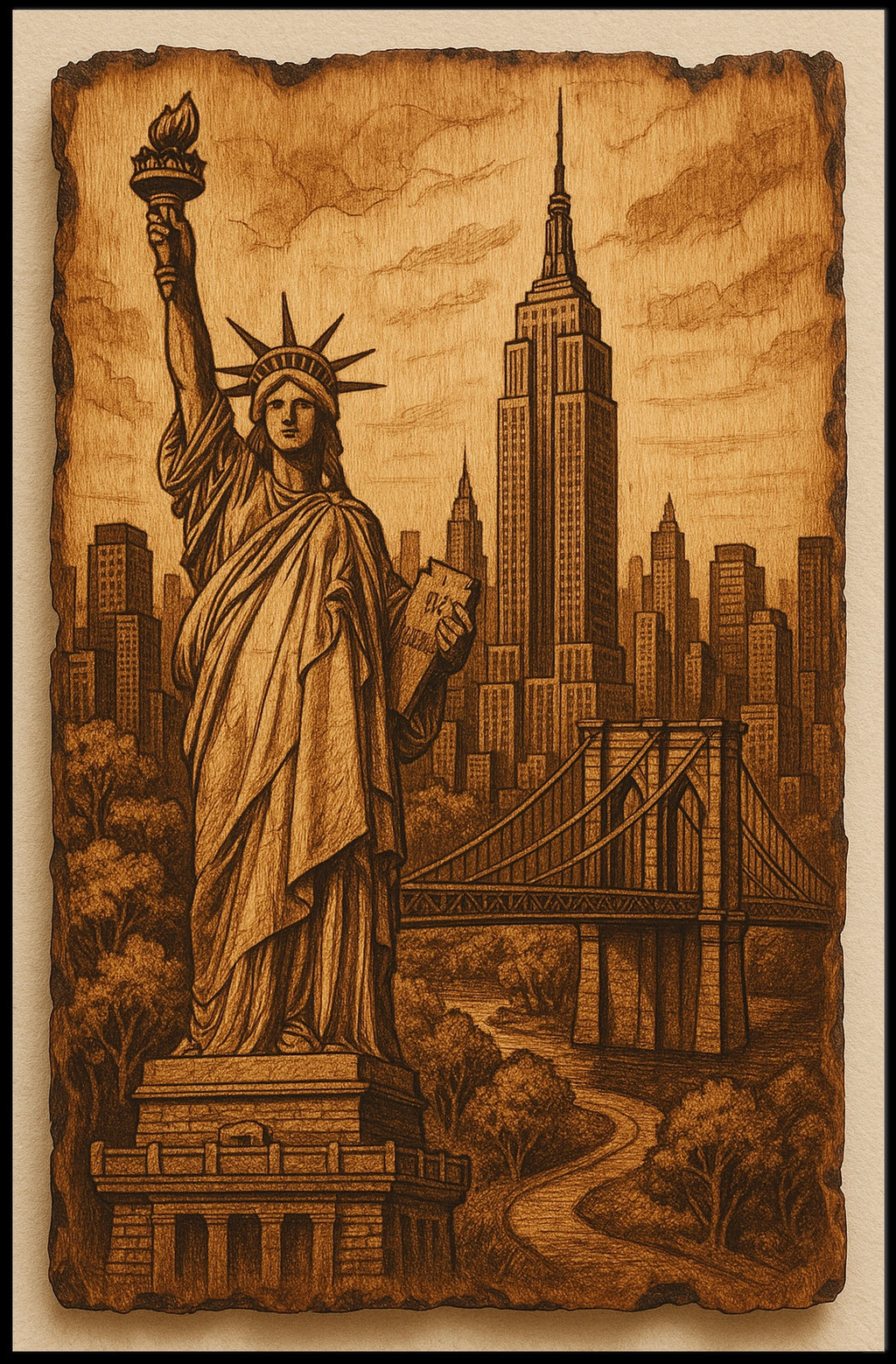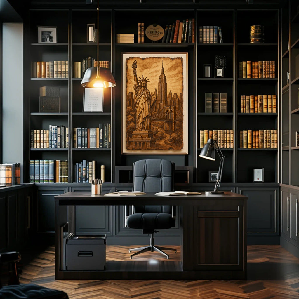Immerse yourself in the timeless allure of New York City with this sepia-toned poster, featuring a masterful illustration of iconic landmarks. The Statue of Liberty takes center stage, embodying freedom and hope, while the Empire State Building anchors the skyline in warm, vintage detail. This piece complements any space that celebrates classic design and urban charm.