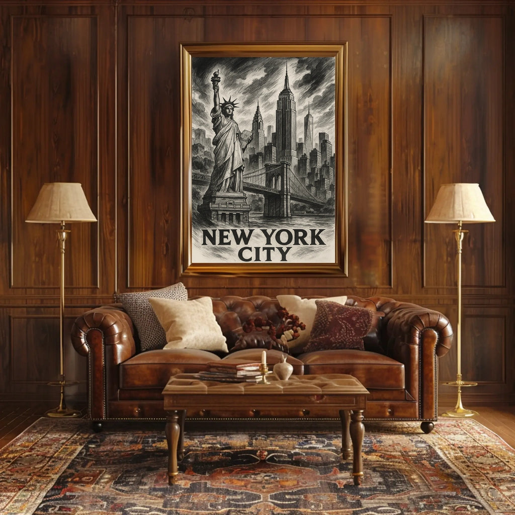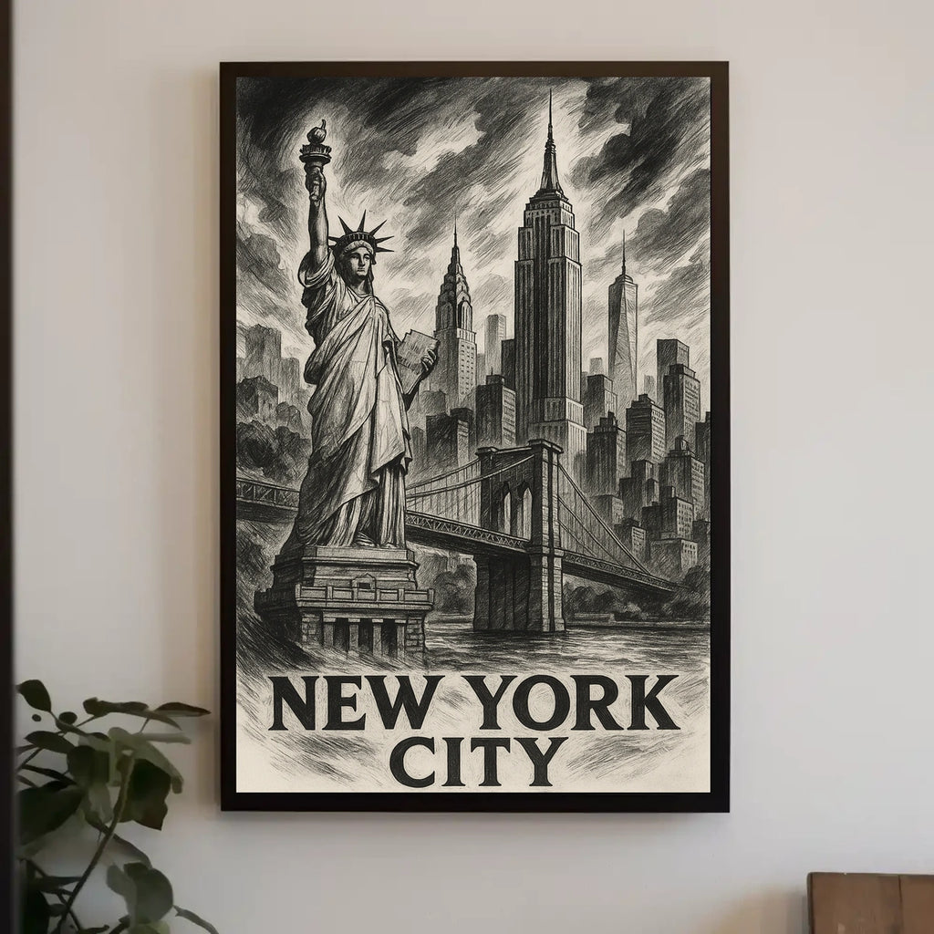 Experience the grandeur of New York City with this exquisite poster, a vintage black-and-white sketch that captures the Statue of Liberty, Empire State Building, Chrysler Building, and Brooklyn Bridge. The dramatic skyline and bold line work add timeless urban charm to any wall.