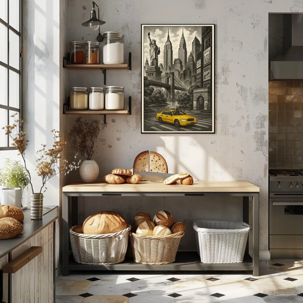 Immerse yourself in the vibrant energy of New York City with this stunning poster. Featuring a stylized depiction of the city, it highlights a classic yellow taxi crossing a bustling street. The backdrop showcases iconic landmarks like the Statue of Liberty, Empire State Building, and Chrysler Building, blending nostalgia with bold urban charm.