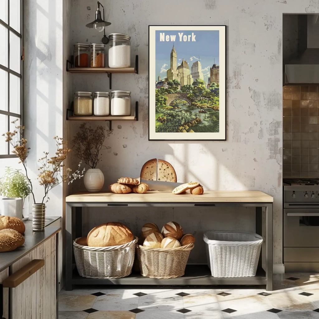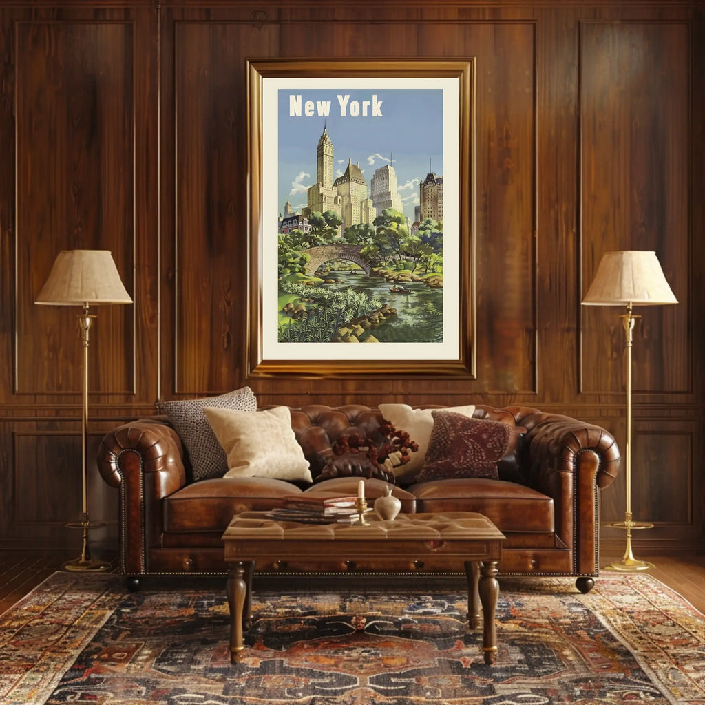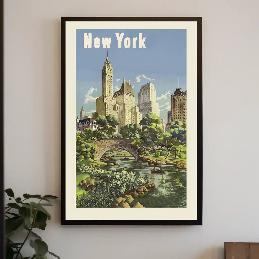 Capture the serene vibrancy of a timeless New York City with this Vintage Urban Cityscape Poster. The scene blends lush park greenery and a graceful stone bridge with a distant, iconic skyline, offering a tranquil, Central Park-inspired mood that elevates any room and lifestyle.