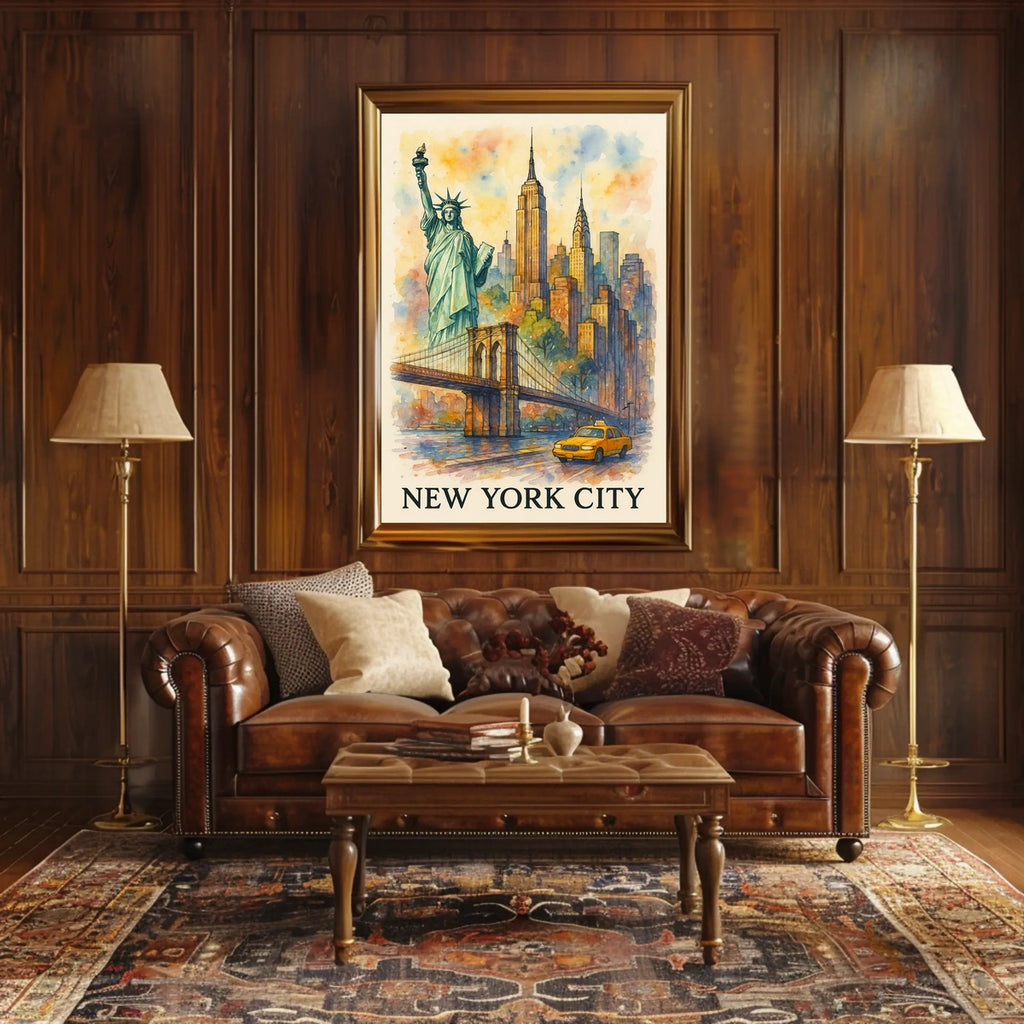 - Iconic landmarks unified in a single watercolor scene — a cohesive NYC story that sparks conversation and anchors any wall.