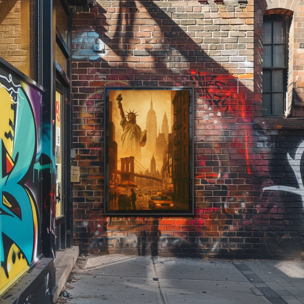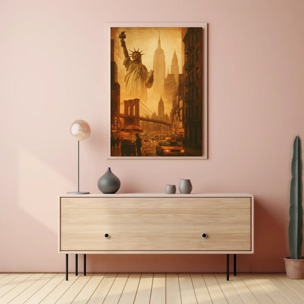 Immerse yourself in the iconic essence of New York City with this striking poster. Featuring the Statue of Liberty, the Empire State Building, and the Brooklyn Bridge, it captures the city’s vibrant energy and timeless allure for any urban living space. This NYC poster blends iconic skyline art with modern design to suit apartments, studios, or homes.