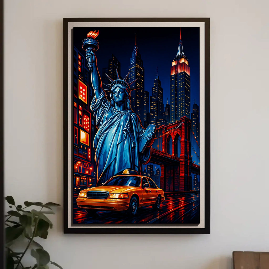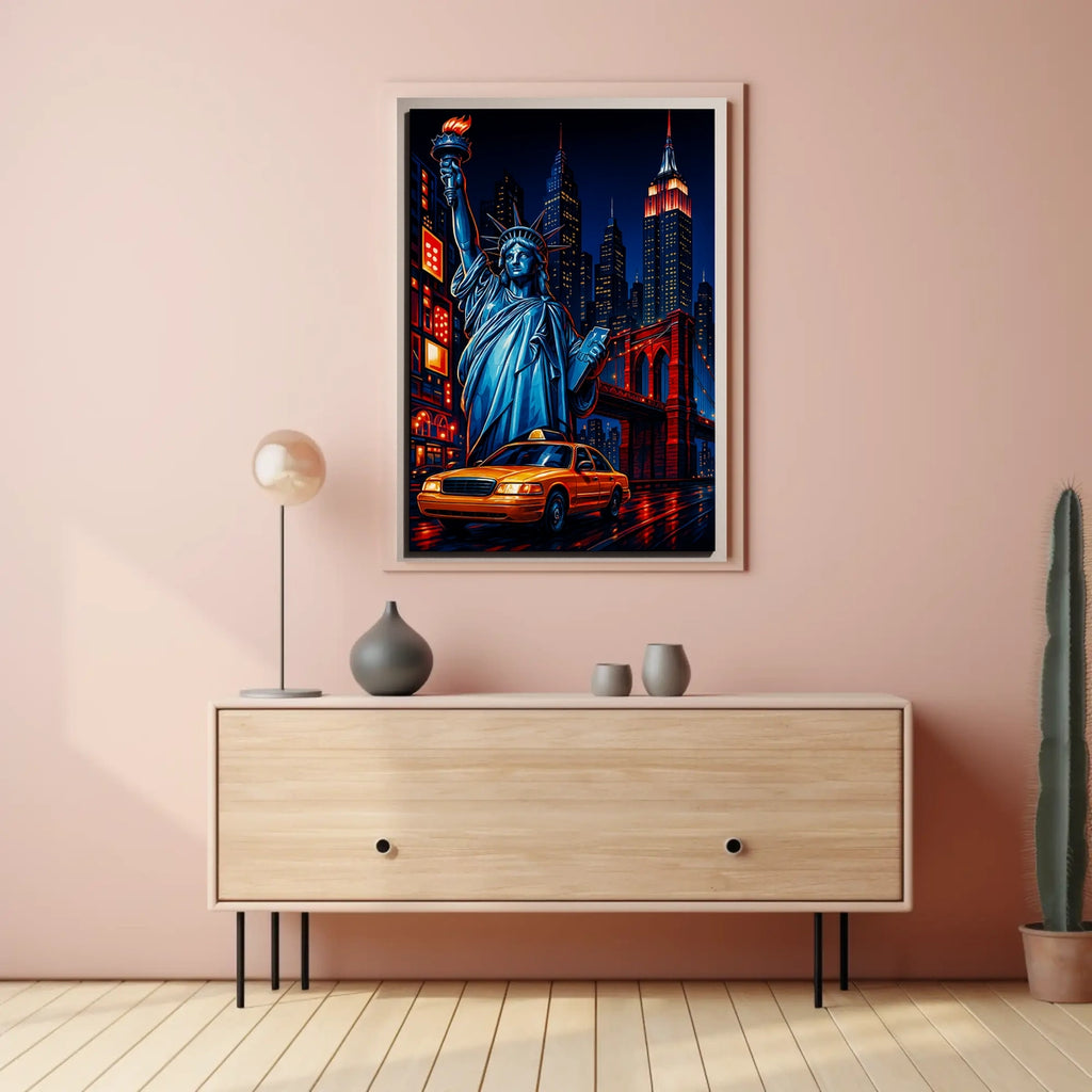 Immerse yourself in the vibrant energy of New York City with the New York Nights poster. This striking artwork captures iconic landmarks like the Statue of Liberty and the Brooklyn Bridge against a dazzling skyline, with a classic yellow taxi adding an authentic NYC touch.