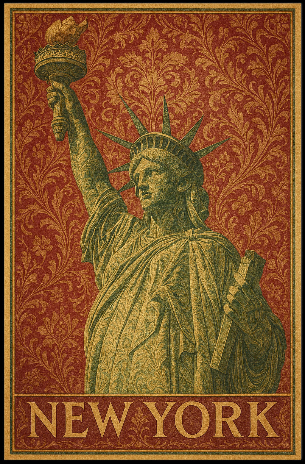 - Detailed design highlighting the iconic silhouette of the statue against a New York skyline