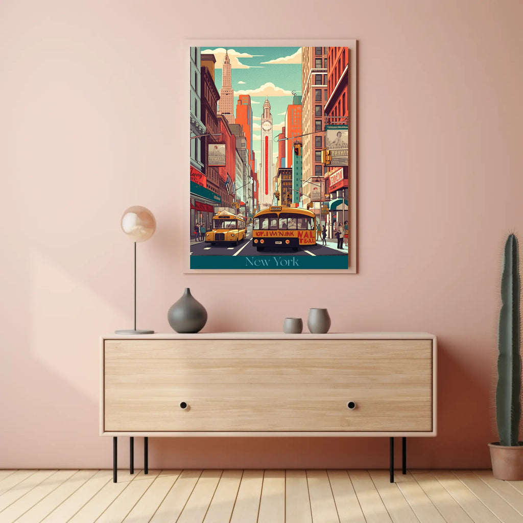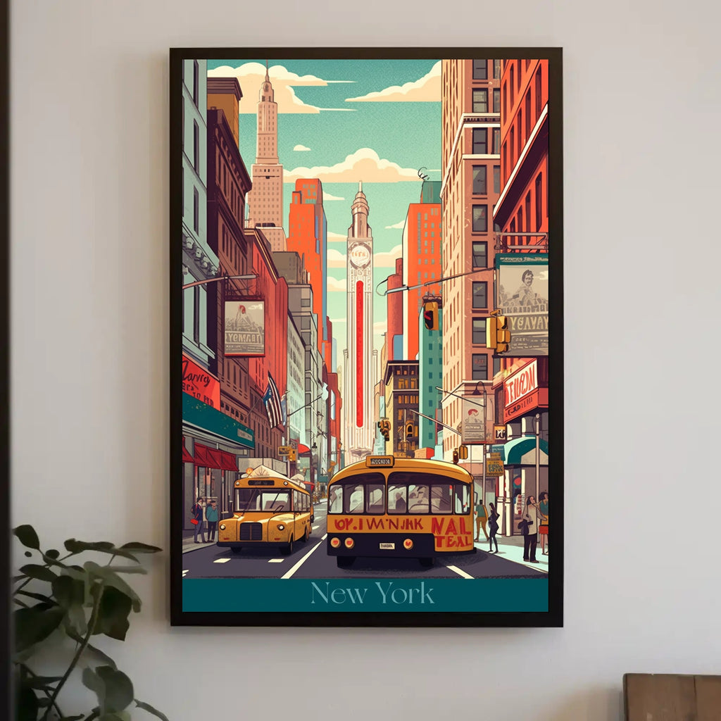 Experience the vibrant energy of New York City with this captivating poster. It intricately depicts a bustling street scene featuring two vintage-style buses, surrounded by a diverse array of pedestrians. The cityscape in the background highlights tall, architecturally significant buildings reminiscent of the early to mid-20th century. This illustration combines a modern style with a retro twist, utilizing bold lines and a striking, cartoon-like aesthetic. A warm, nostalgic color palette of reds, oranges, yellows, along with cool blues and greens, creates a lively urban atmosphere. Perfect for fans of classic city life.