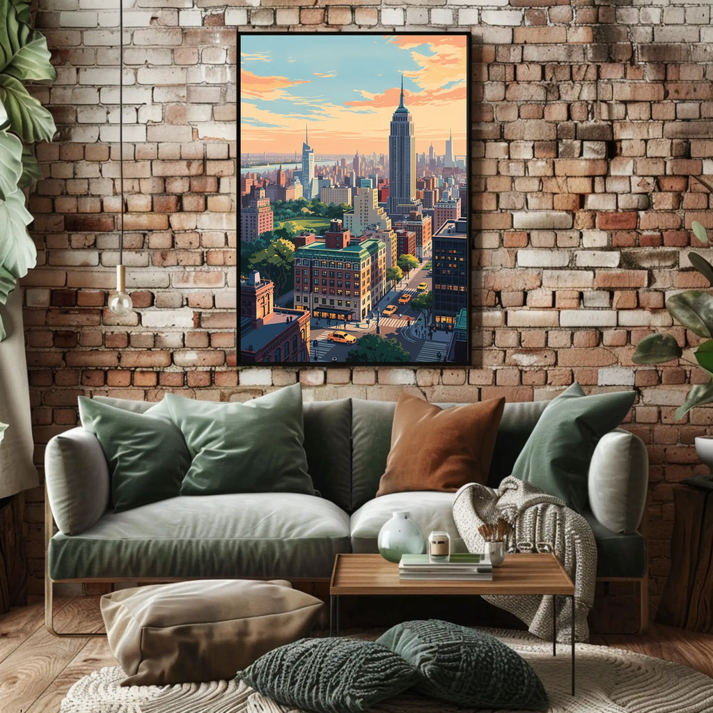 Capture the heartbeat of New York with this Sunset Cityscape poster. A digital illustration pools warm sunset tones with cool urban shadows, highlighting iconic skyscrapers and tranquil parks. The result is a bold, cinematic piece that elevates any wall with city-chic energy. Perfect for living rooms, offices, or foyer spaces that crave modern, urban flair.