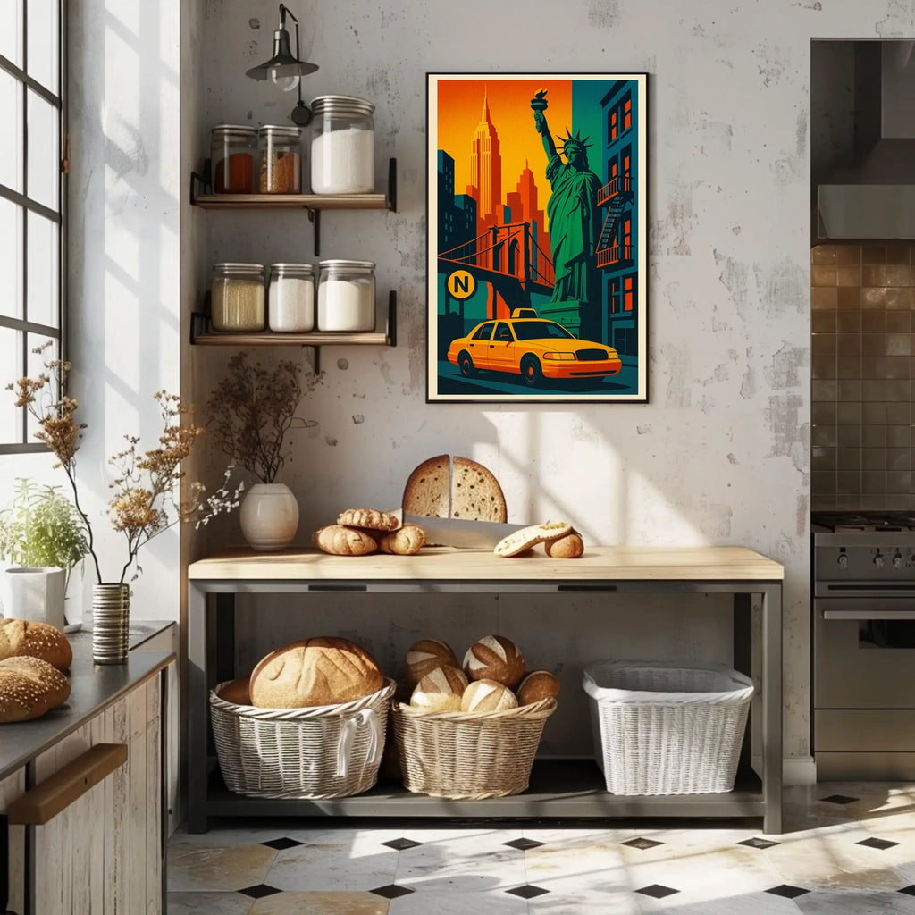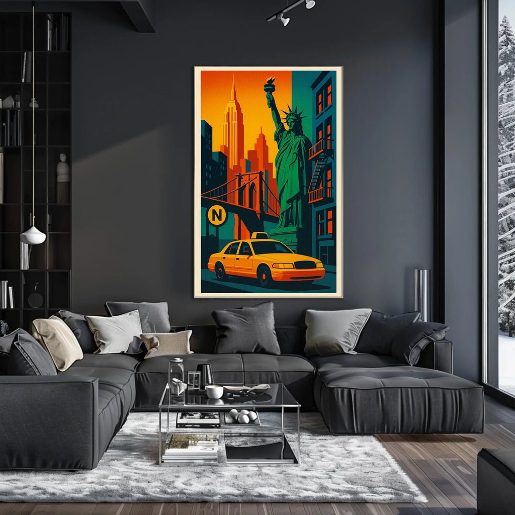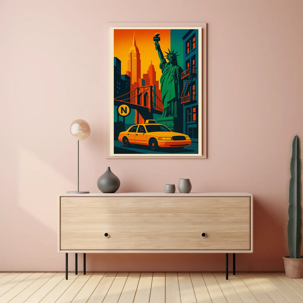 Immerse yourself in the bustling energy of the Big Apple with this vibrant New York Vibes poster. This artwork captures iconic landmarks—the Statue of Liberty, the Brooklyn Bridge, and a quintessential yellow taxi—bringing bold urban charm to any wall.