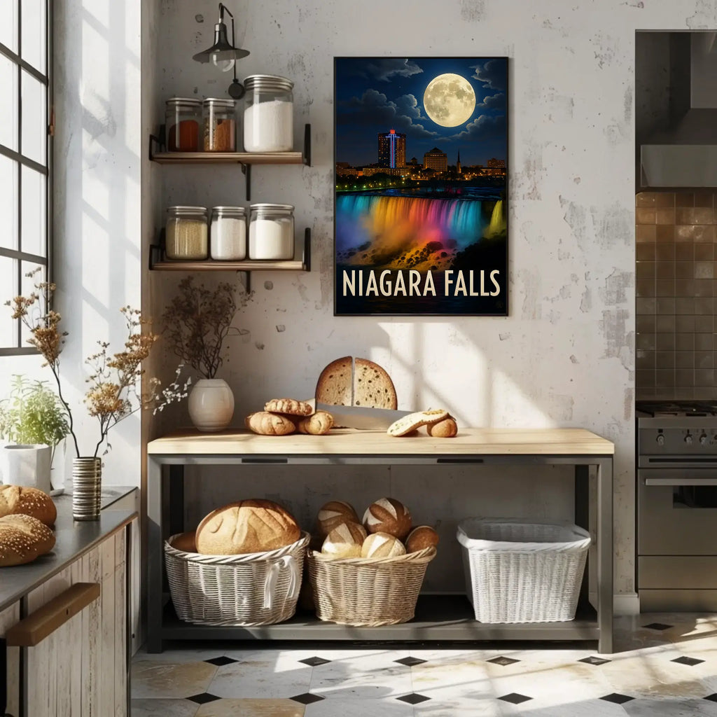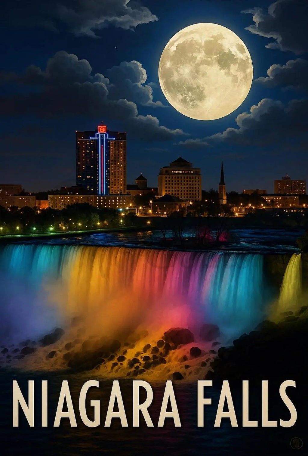 Bring the magic of a moonlit evening at Niagara Falls into your home with this striking travel poster from PosterGoat. A luminous full moon hangs over a glowing city skyline while the falls tumble in vivid rainbow hues—blending retro travel-poster charm with vaporwave/synthwave colors for a dramatic, modern statement piece.