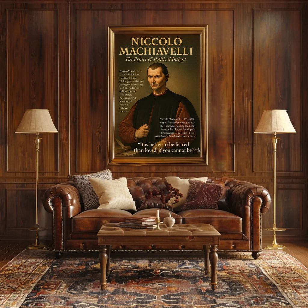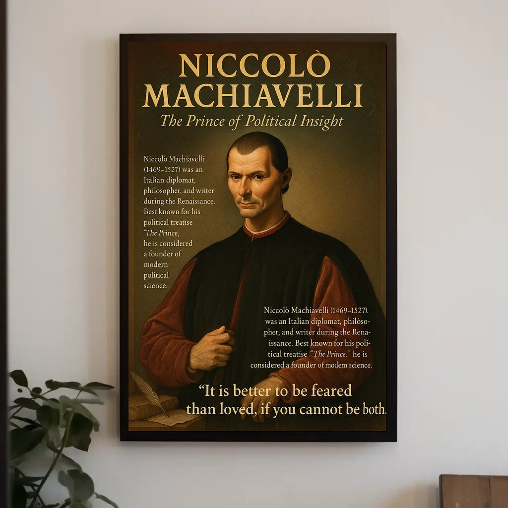 Bring a touch of timeless thought to your space with this Niccolò Machiavelli poster, celebrating The Prince of Political Insight. Designed for decor lovers and curious minds, this art print blends Renaissance typography with a modern wall art vibe. It’s the kind of piece that feels both classic and current, whether you hang it in a living room, study, or hallway. Easy to frame and easy to love, it makes politics and literature feel approachable and stylish.