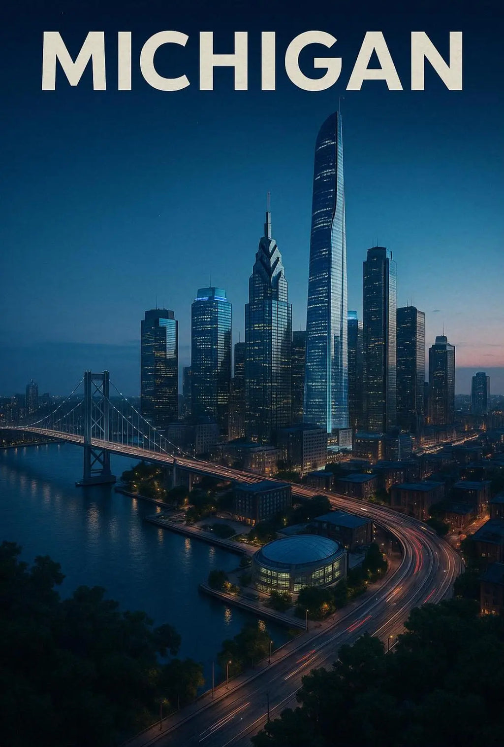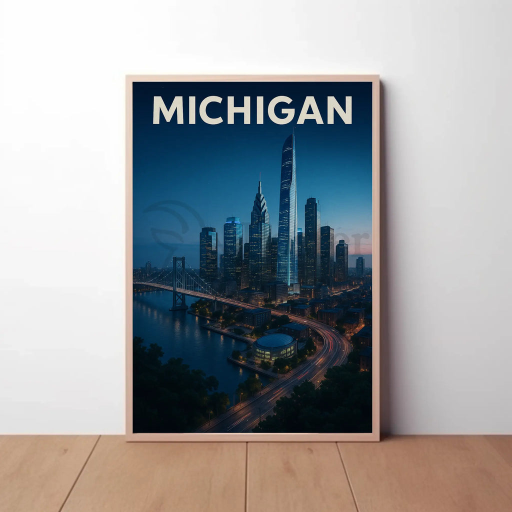 Bring Michigan's nocturnal energy home with the Nighttime Michigan Cityscape Vibrant Urban Travel Poster by PosterGoat. This photorealistic print captures a luminous skyline, elegant skyscrapers and a sweeping suspension bridge at dusk — a dramatic, contemporary piece that transforms any wall into an urban landmark.