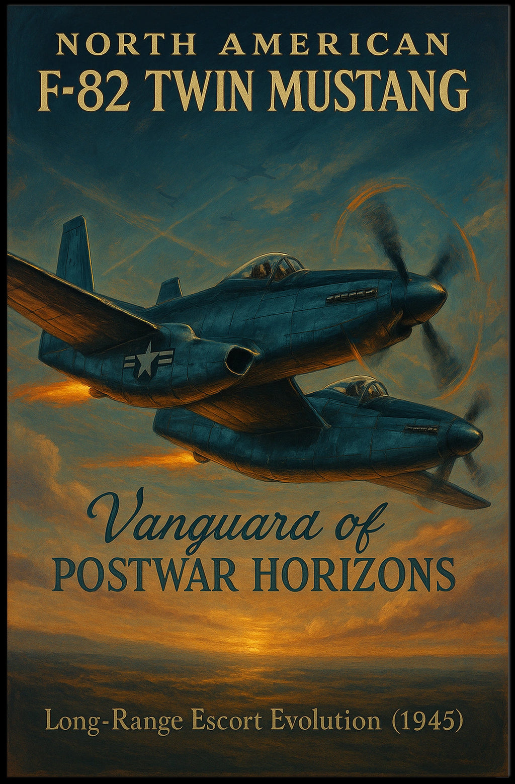Immerse yourself in the golden age of aviation with the North American F-82 Twin Mustang Vintage Poster. This World War II era aircraft is beautifully illustrated in flight against a dramatic sky, capturing postwar technological advancement and patriotic pride.