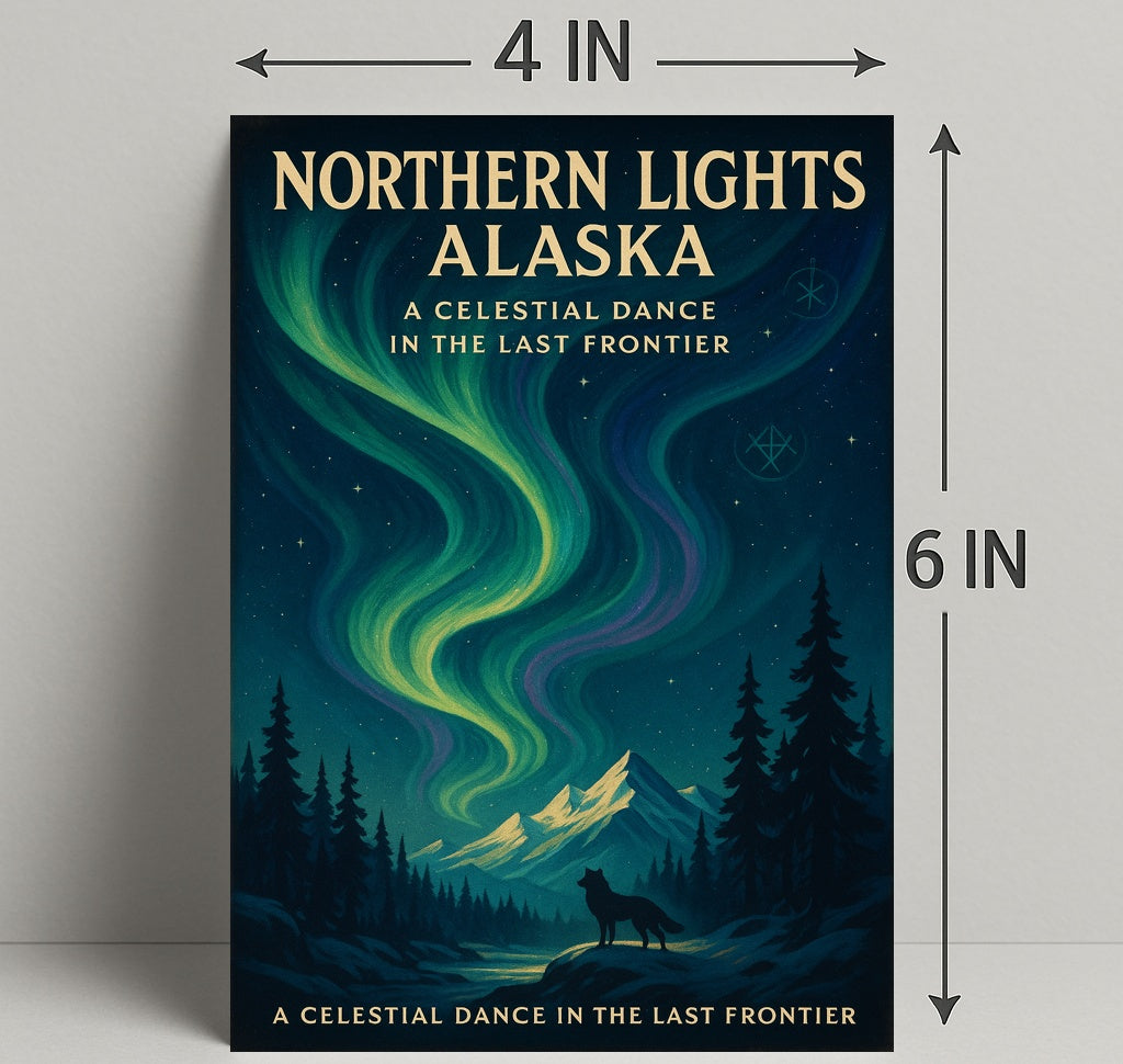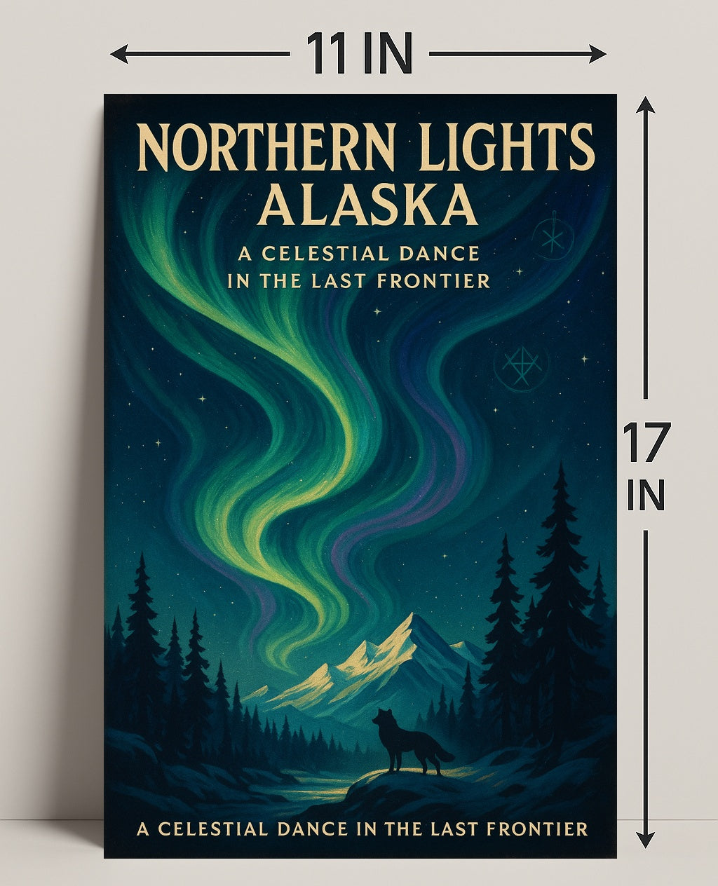 Whether you're searching for a memorable gift, a scenic souvenir, or a bold piece of art to finish a room, this Northern Lights poster transforms ordinary walls into a celestial scene. Add a touch of the Last Frontier to your space today — order now from PosterGoat and bring the celestial dance home.