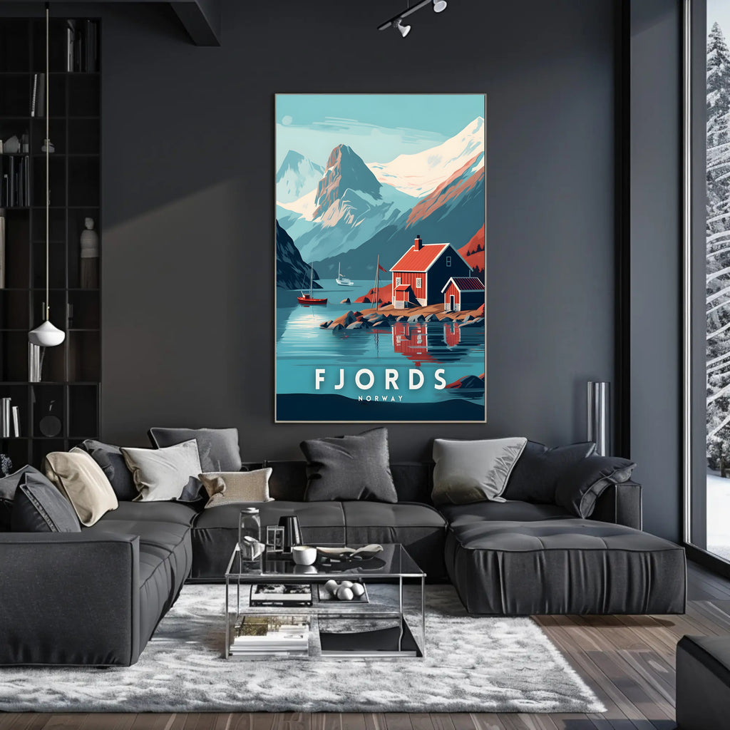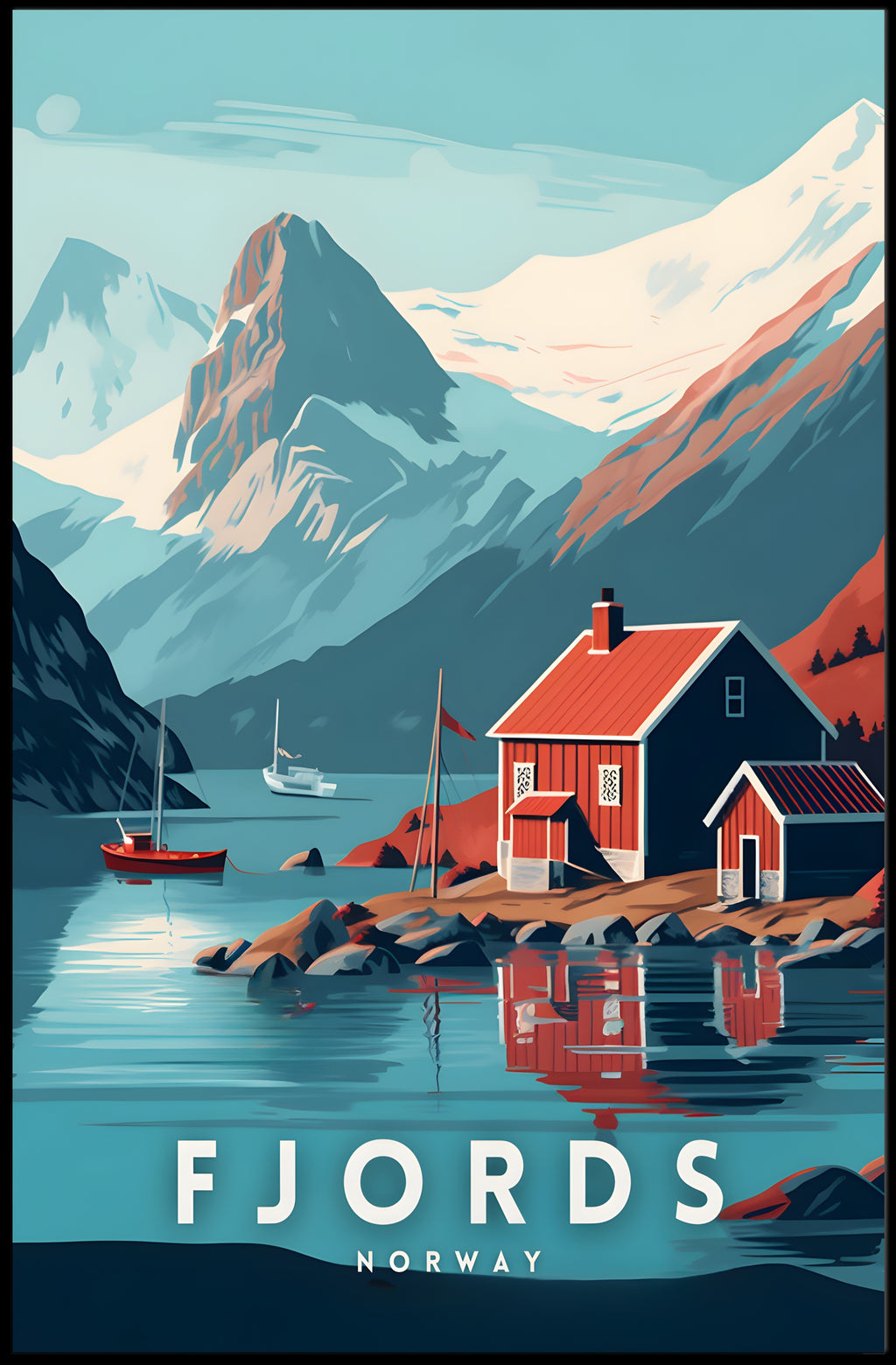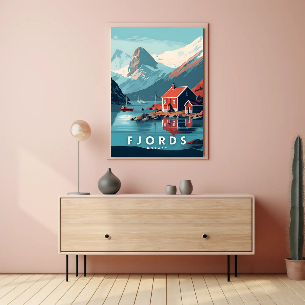 Immerse yourself in the breathtaking beauty of a Norwegian fjord with this captivating poster. The artwork showcases a picturesque red cabin with white trim, nestled on the serene water's edge. Majestic snow-capped mountains rise dramatically in the background, adding a sense of grandeur. Bold colors and clean lines define the modern, stylized artistic approach, while vibrant red and blue tones accentuate the natural splendor of Norway. This poster evokes a peaceful, tranquil mood, ideal for anyone enchanted by Nordic landscapes or looking to celebrate Norway's stunning travel destinations through art.