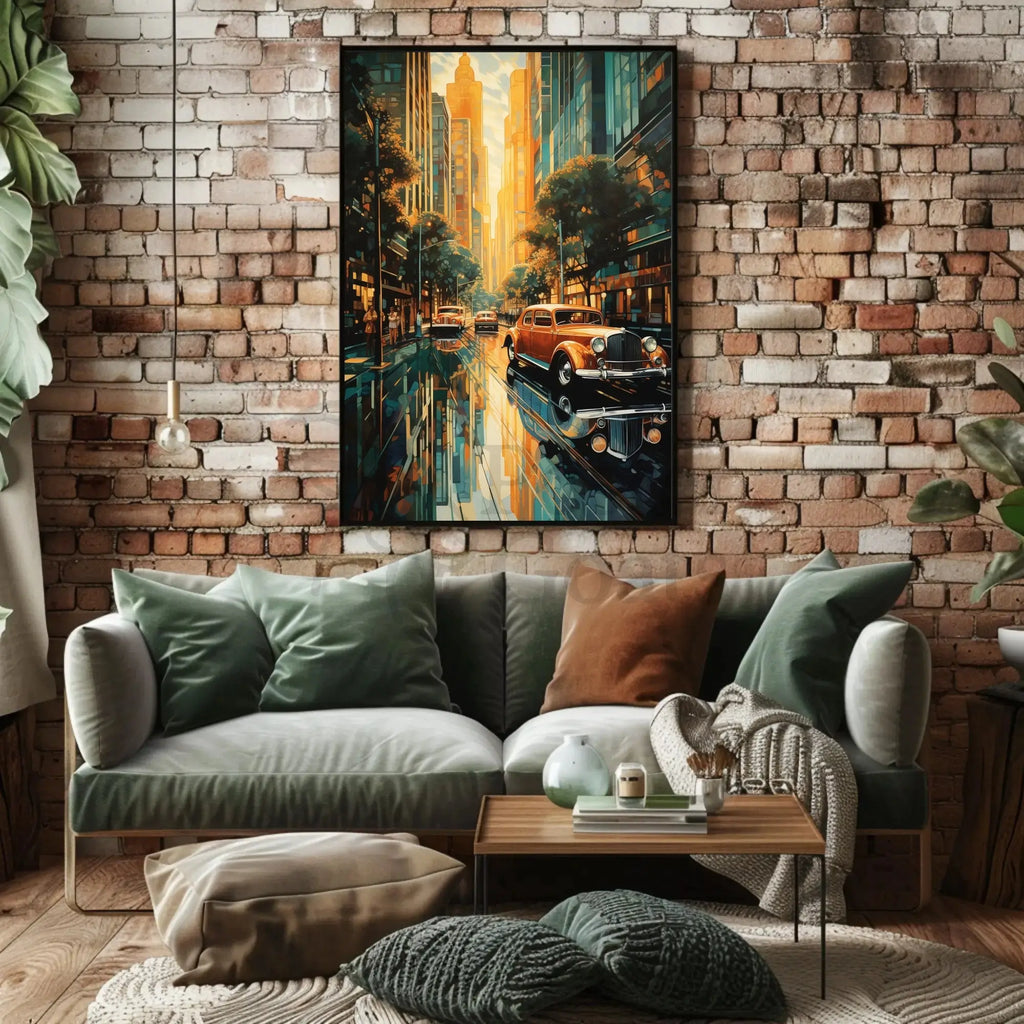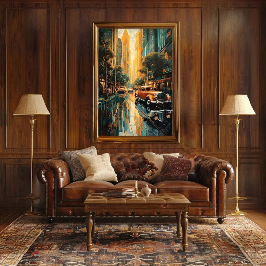 Perfect for fans of vintage cityscape art and retro style decor, the piece blends impressionistic color blocks with photorealism details to create a dynamic mood: the glow of late-afternoon light, the polished chrome of vintage cars, and the deep reflections that double the scene for cinematic depth.