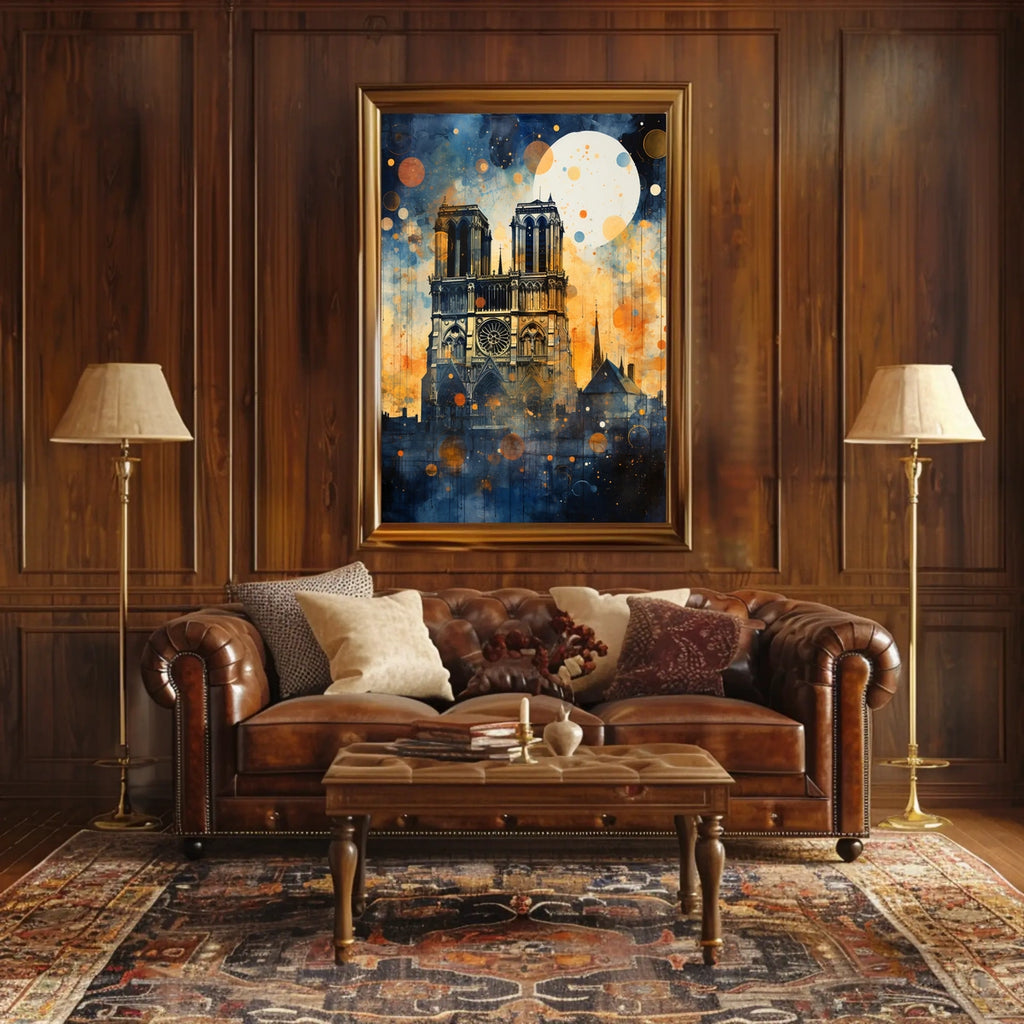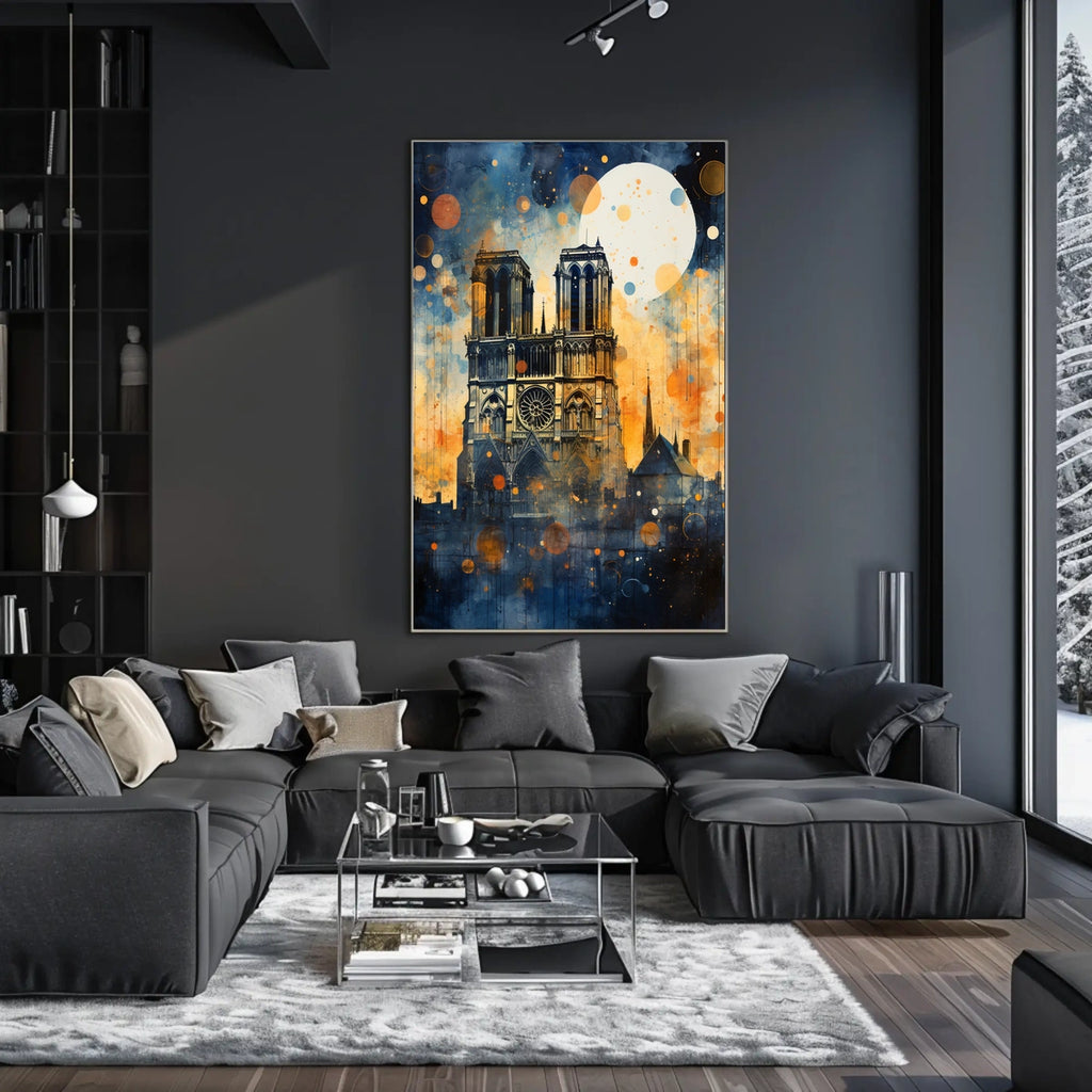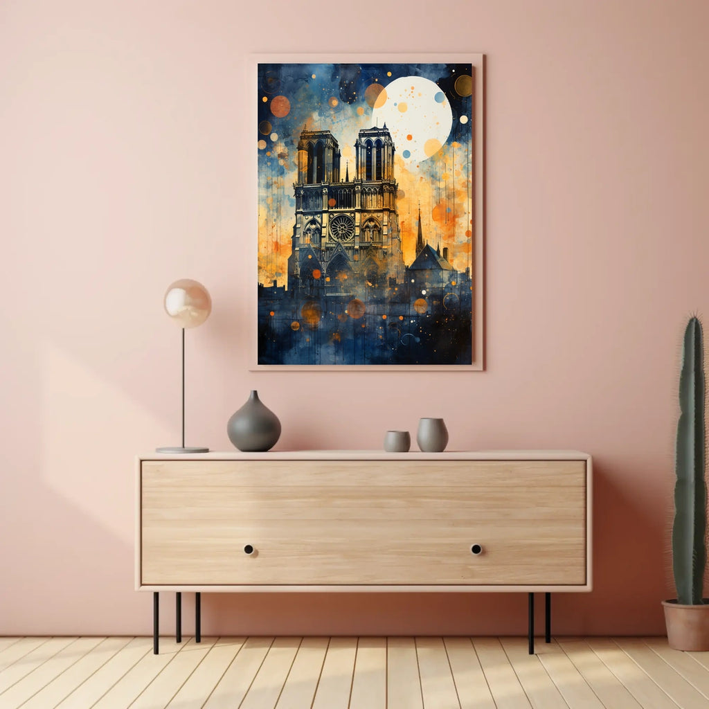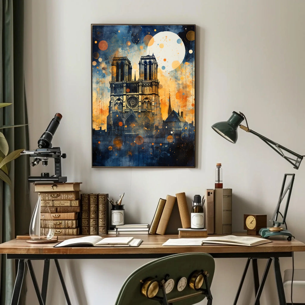This captivating poster showcases the awe-inspiring architecture of the Notre-Dame Cathedral in Paris, intricately depicted with its renowned twin towers and sophisticated facade. The backdrop, filled with abstract shapes reminiscent of celestial bodies, adds a layer of mystique to the piece. The surrealistic and modern abstract style, featuring a vibrant mix of blues and oranges, brings a dreamlike, ethereal quality to the poster. Perfect for art enthusiasts and admirers of iconic architecture, this piece is designed to ignite wonder and appreciation for the historic marvel set against an imaginative, otherworldly setting.