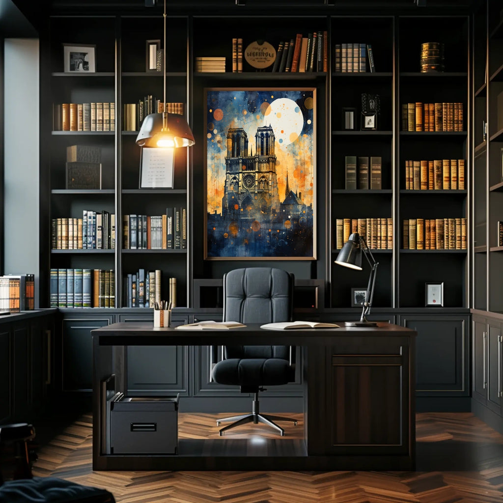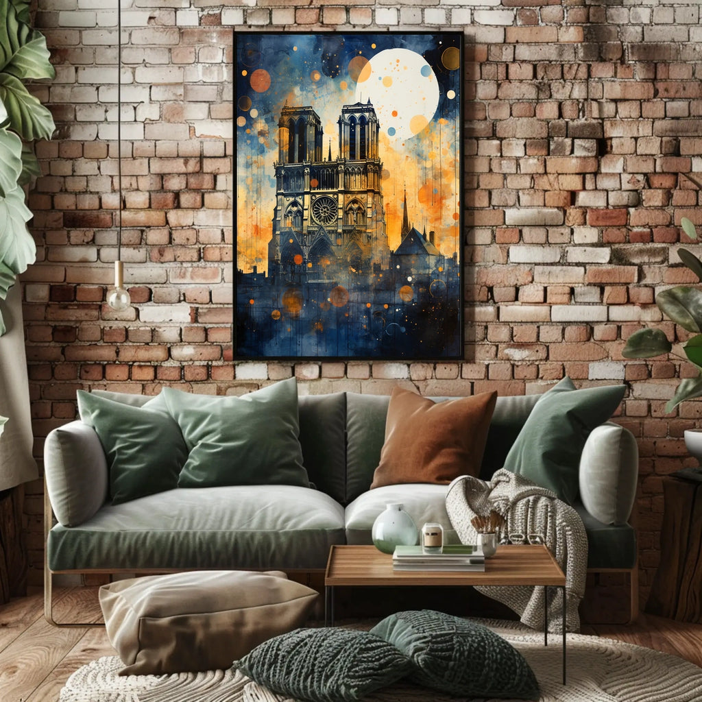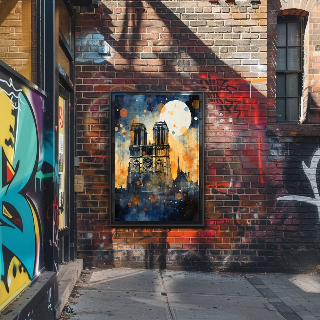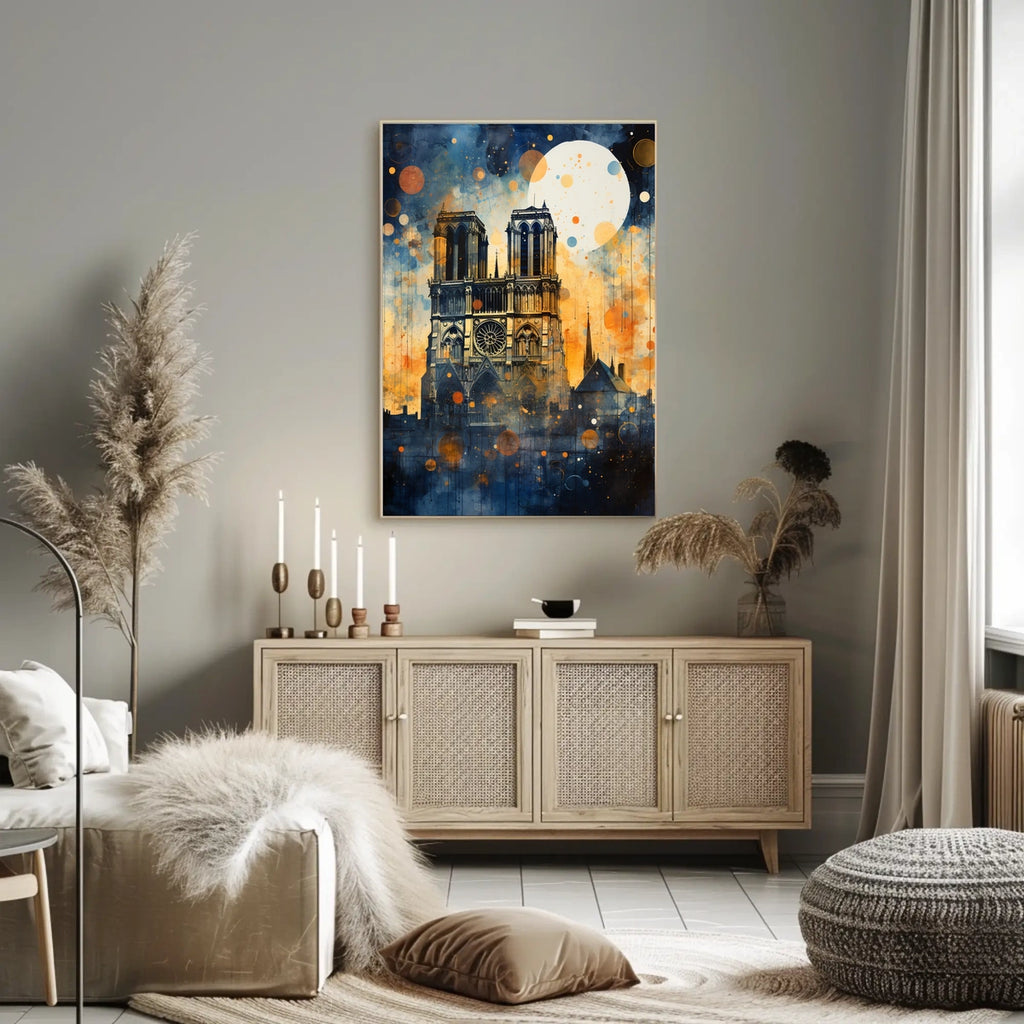 This captivating poster showcases the awe-inspiring architecture of the Notre-Dame Cathedral in Paris, intricately depicted with its renowned twin towers and sophisticated facade. The backdrop, filled with abstract shapes reminiscent of celestial bodies, adds a layer of mystique to the piece. The surrealistic and modern abstract style, featuring a vibrant mix of blues and oranges, brings a dreamlike, ethereal quality to the poster. Perfect for art enthusiasts and admirers of iconic architecture, this piece is designed to ignite wonder and appreciation for the historic marvel set against an imaginative, otherworldly setting.