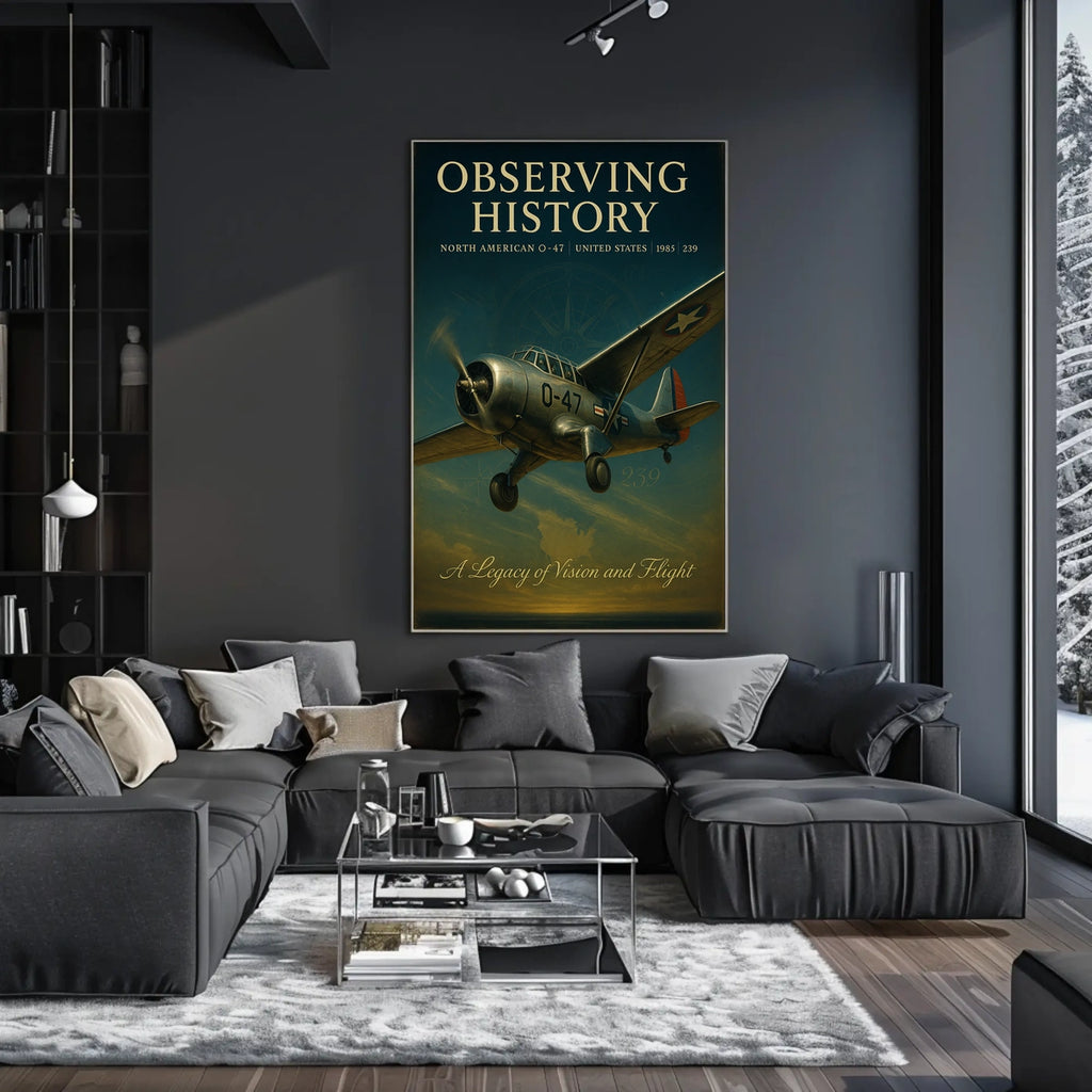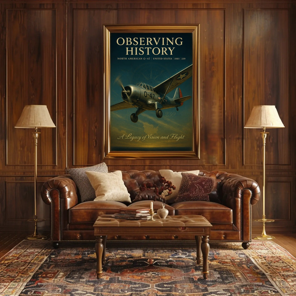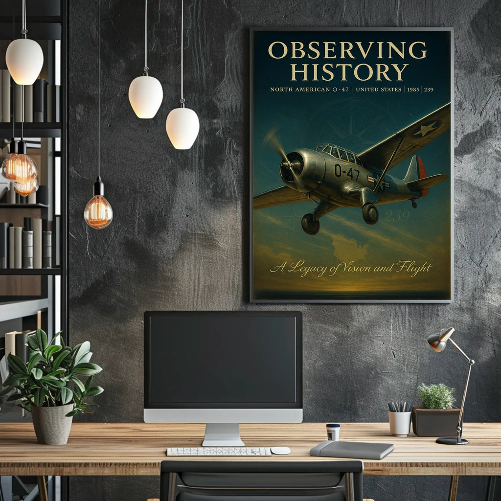 Capture aviation history with this vintage North American O-47 poster, a striking centerpiece for any wall. The meticulously detailed illustration places the mid-20th-century aircraft against a sky painted with the warm hues of dawn or dusk.