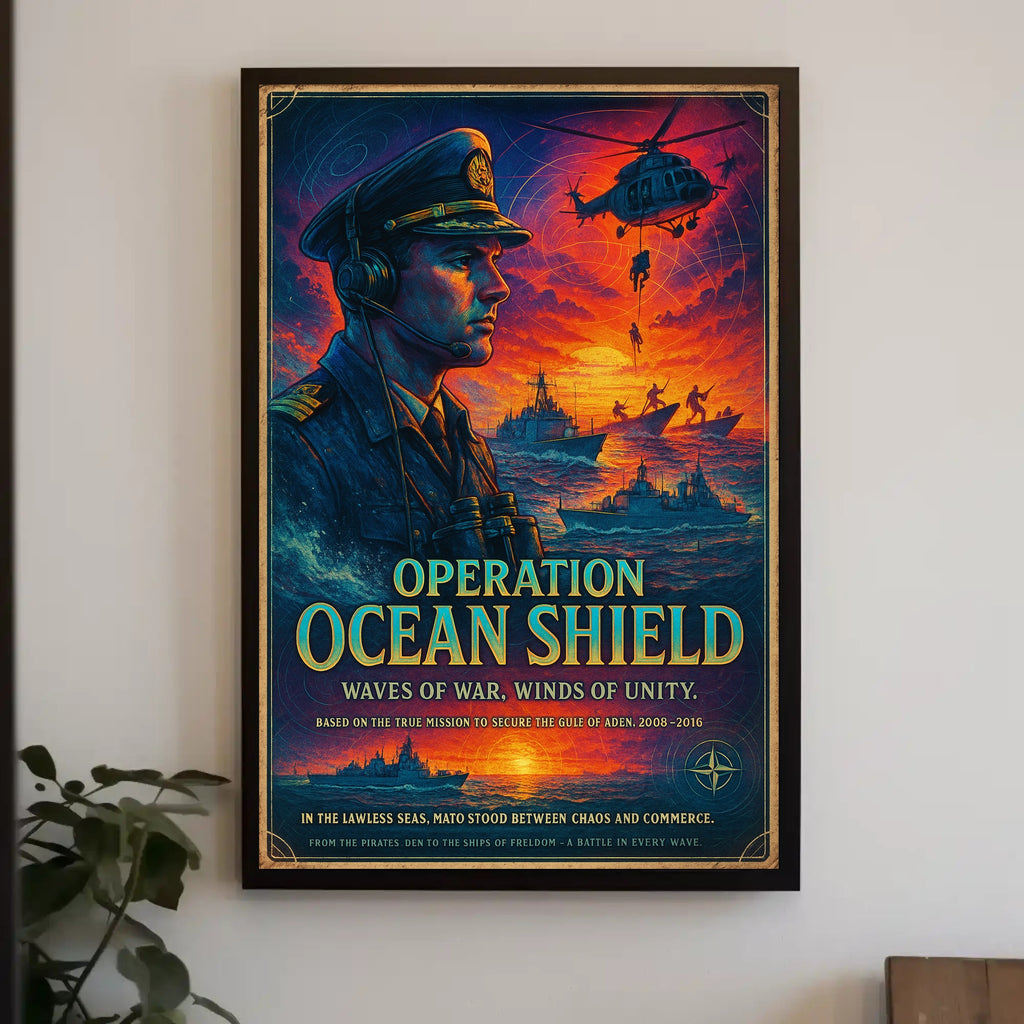 This poster features a cinematic composition: a resolute naval officer in profile, binoculars at hand, set against a fiery sunset where helicopters lower boarding teams and warships cut through churning waves. Rich, saturated tones of orange, teal, and indigo create powerful contrast and an almost cinematic glow that makes every detail pop — from the brass on the officer’s cap to the rippling ocean and silhouetted combat boats on the horizon.