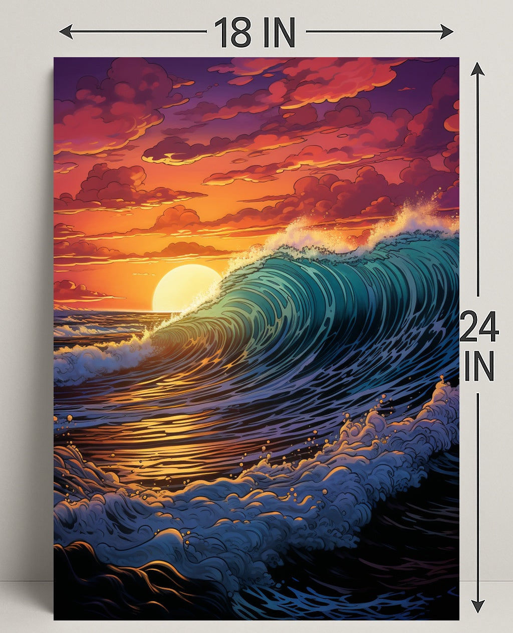 Eye-Catching Design: Featuring vivid hues of orange and blue, this poster captures the serene beauty of a sunset over the waves, instantly drawing attention.
