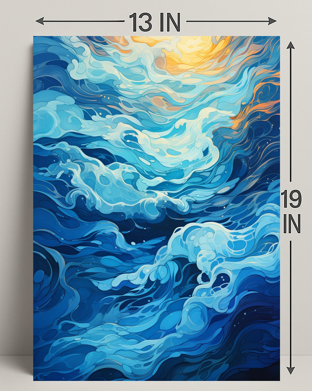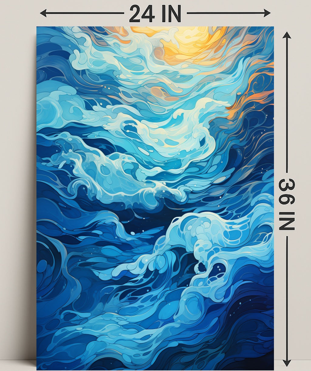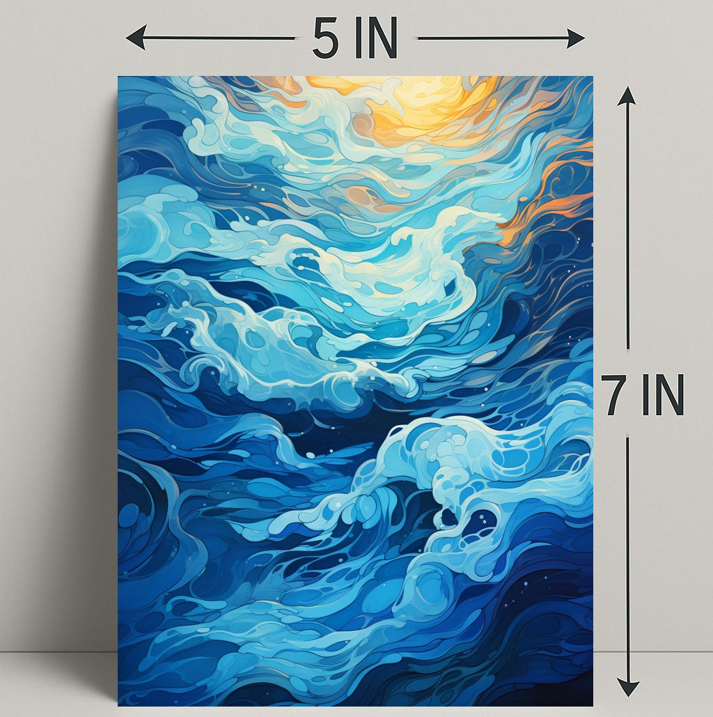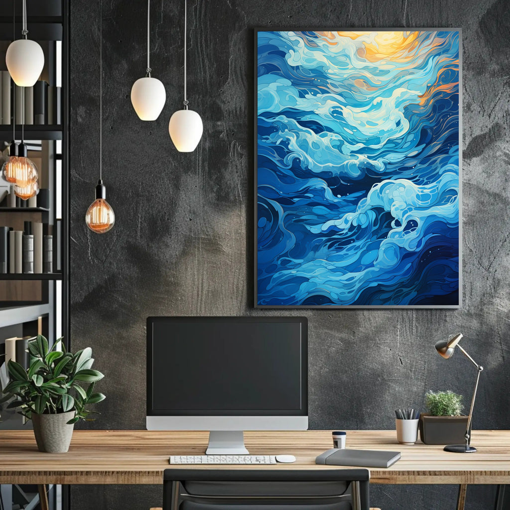 Immerse your space in the calming motion of the Oceanic Whirl Poster by PosterGoat — an artful celebration of ocean waves rendered in flowing, layered blues with sunlit amber highlights. This striking poster blends minimalist composition with dynamic, painterly swirls to create a scenic focal point that brings serenity and movement to any room.