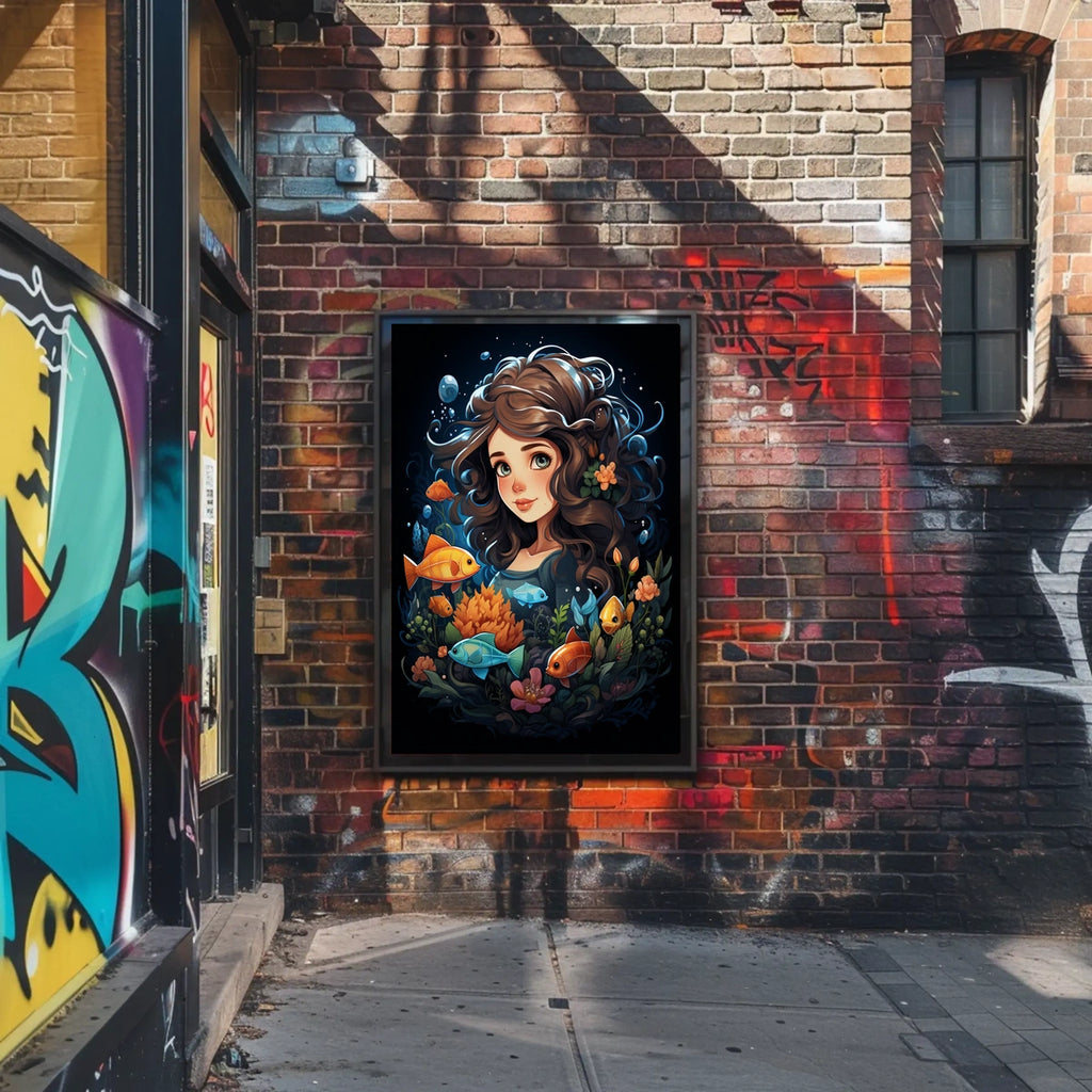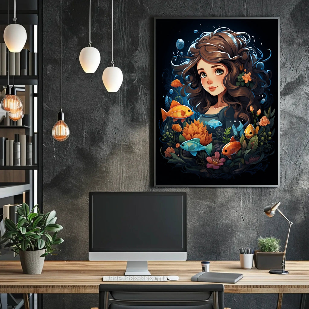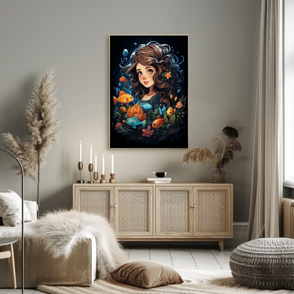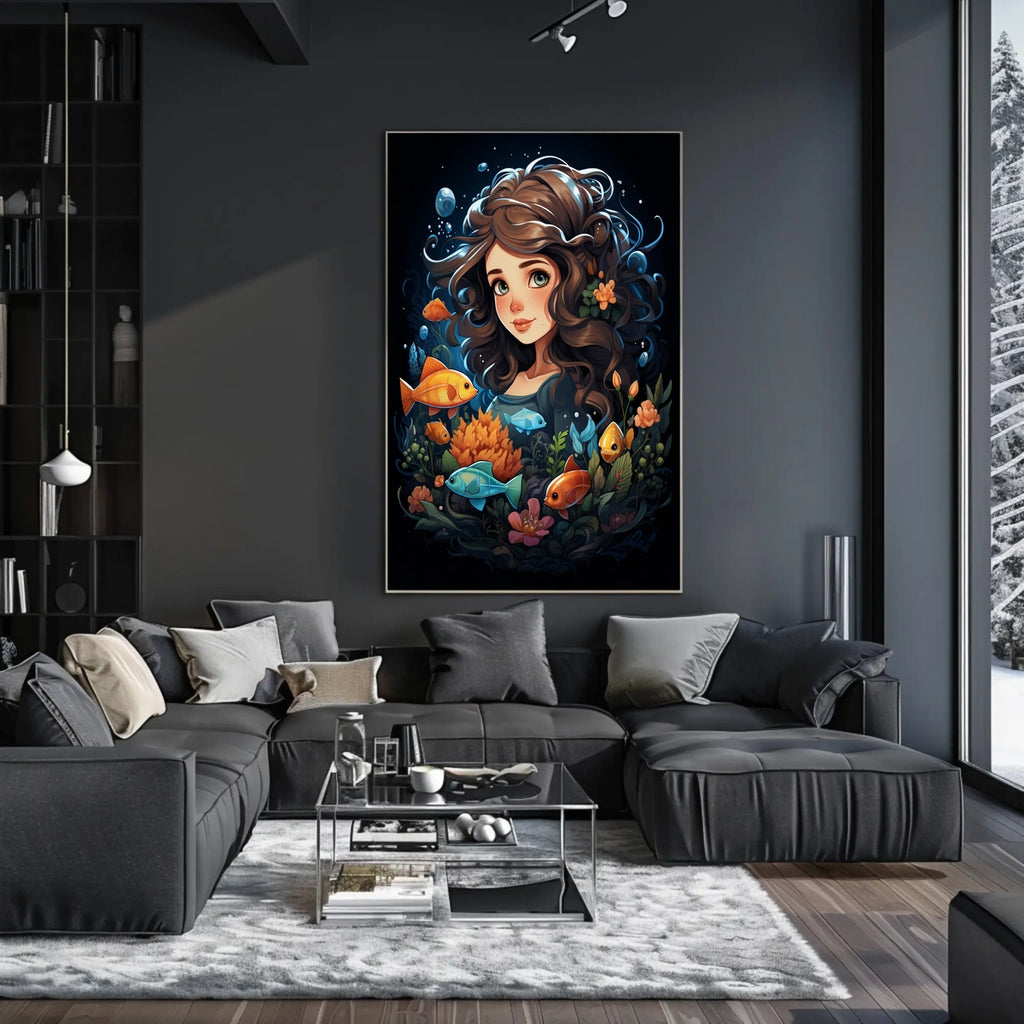 Immerse yourself in Oceans Dream, an enchanting underwater artwork where vibrant fish dance among lush corals around a serene figure. This ocean-inspired piece blends fantasy with nature to spark imagination and calm in any room.