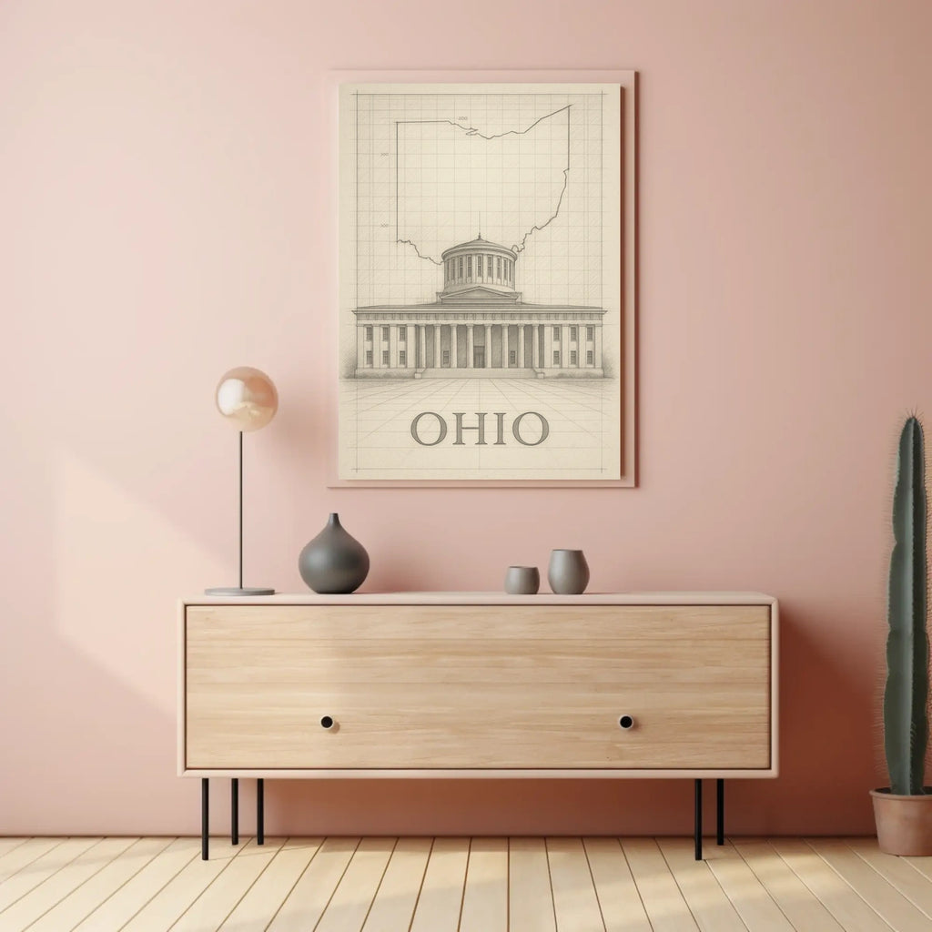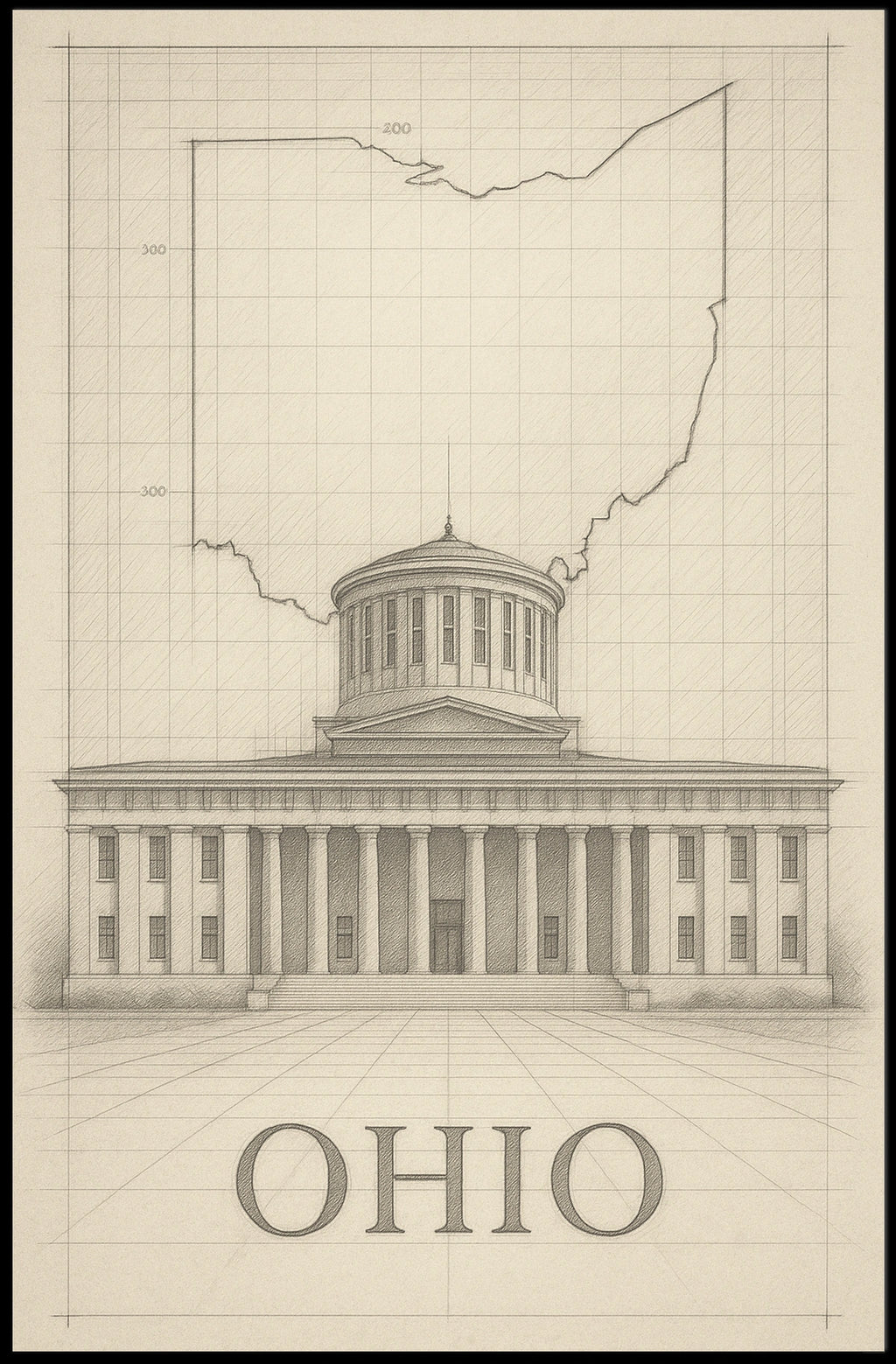 - Detailed blueprint-inspired design highlighting architectural lines of the Ohio State Capitol