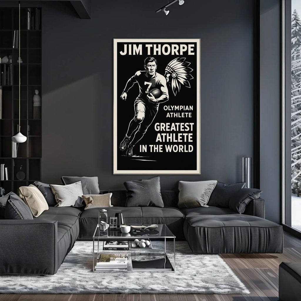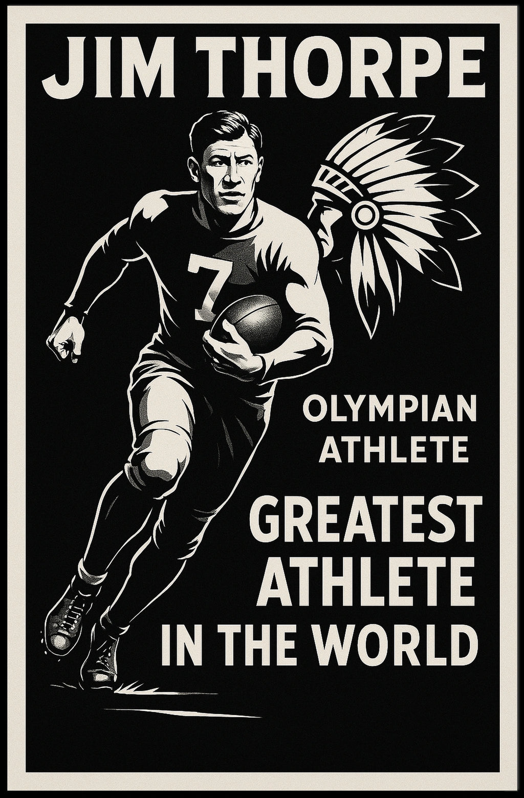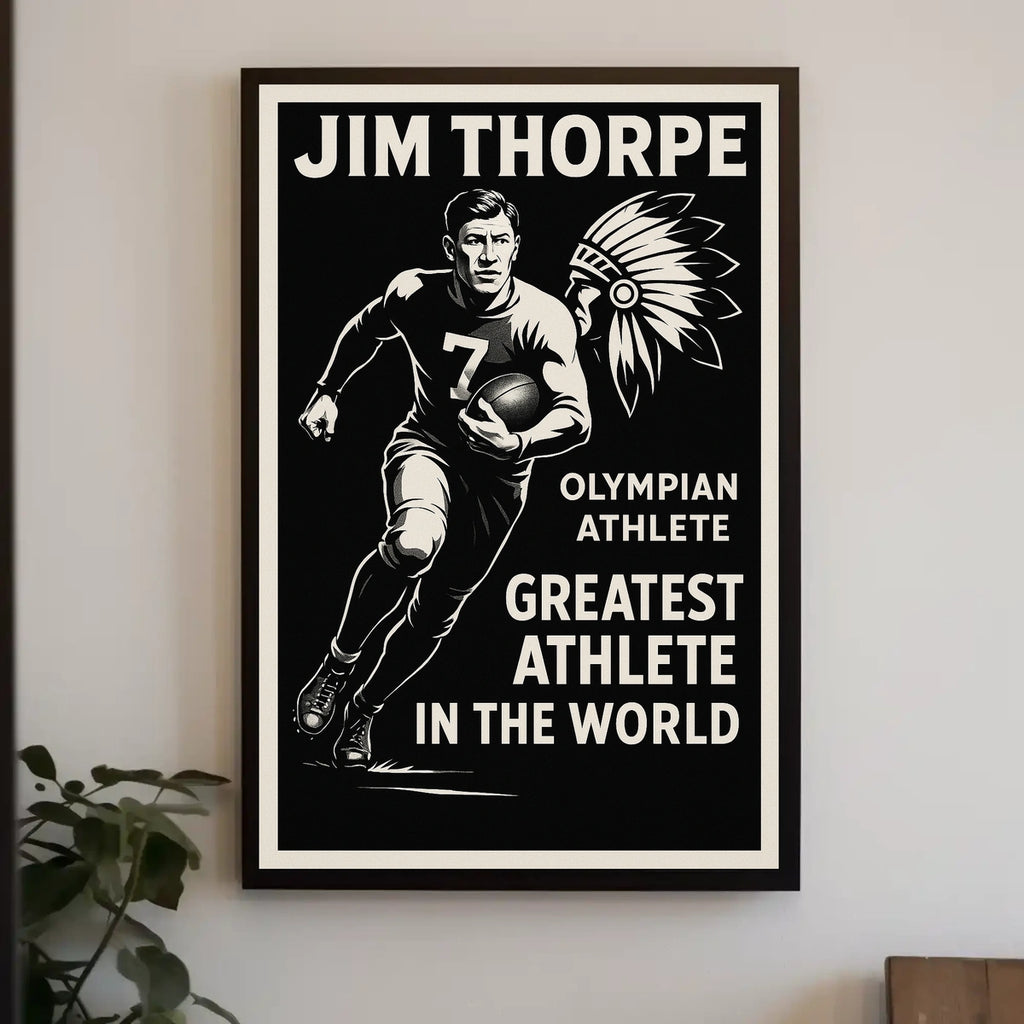 This striking Jim Thorpe poster pays tribute to the Greatest Athlete in the World, celebrating his extraordinary versatility, fearless spirit, and inspirational legacy that energizes fans, athletes, and collectors.