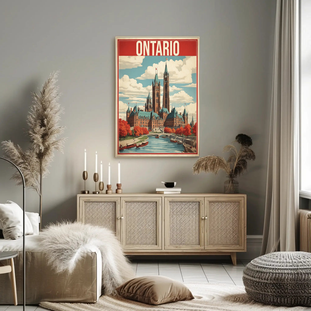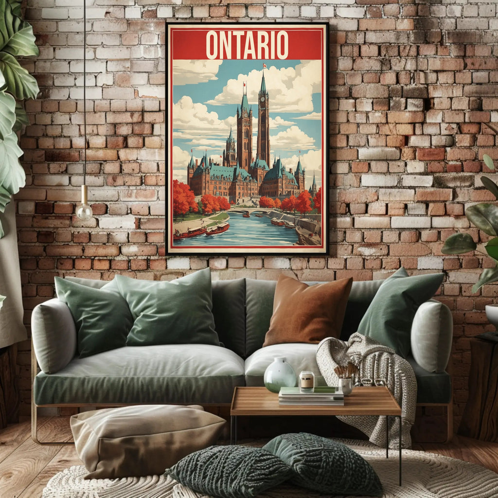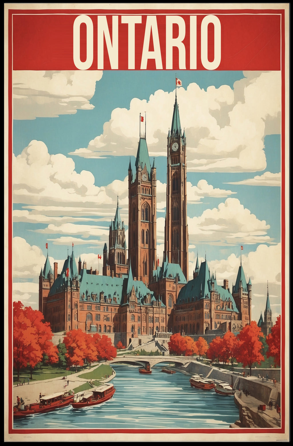 Ontario Parliament Scenic View Vintage Travel Poster from PosterGoat brings iconic Canadian heritage to your wall with a timeless vintage travel aesthetic. This artful print captures the Parliament Buildings rising above a serene river, framed by vibrant autumn foliage and a clear blue sky dotted with stylized clouds — a nostalgic tribute to Ontario’s historic architecture and natural beauty.
