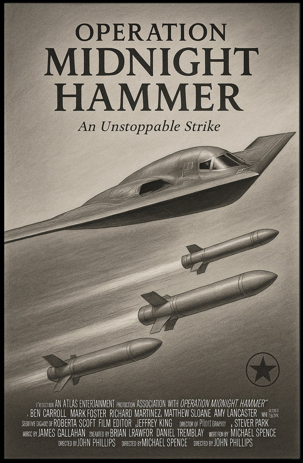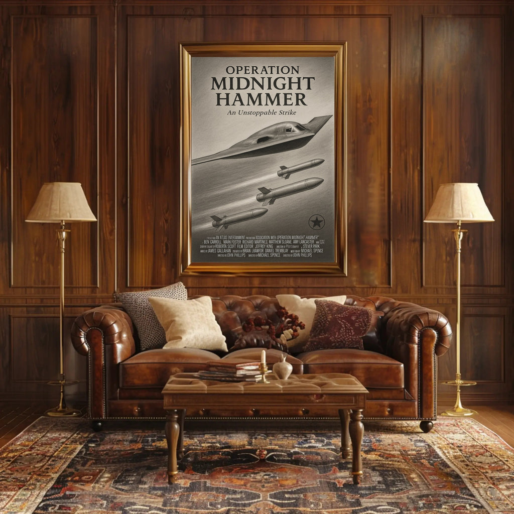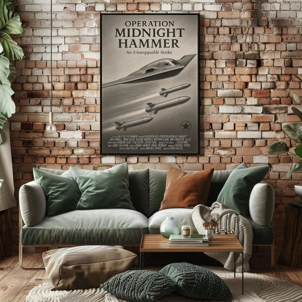 Operation Midnight Hammer Poster from PosterGoat is a striking art print that blends minimalist design with dramatic, vintage-inspired aviation imagery. Rendered in textured monochrome pencil shading, this poster captures the stealthy silhouette of a high‑tech aircraft and trailing missiles — a bold composition that commands attention in any room.