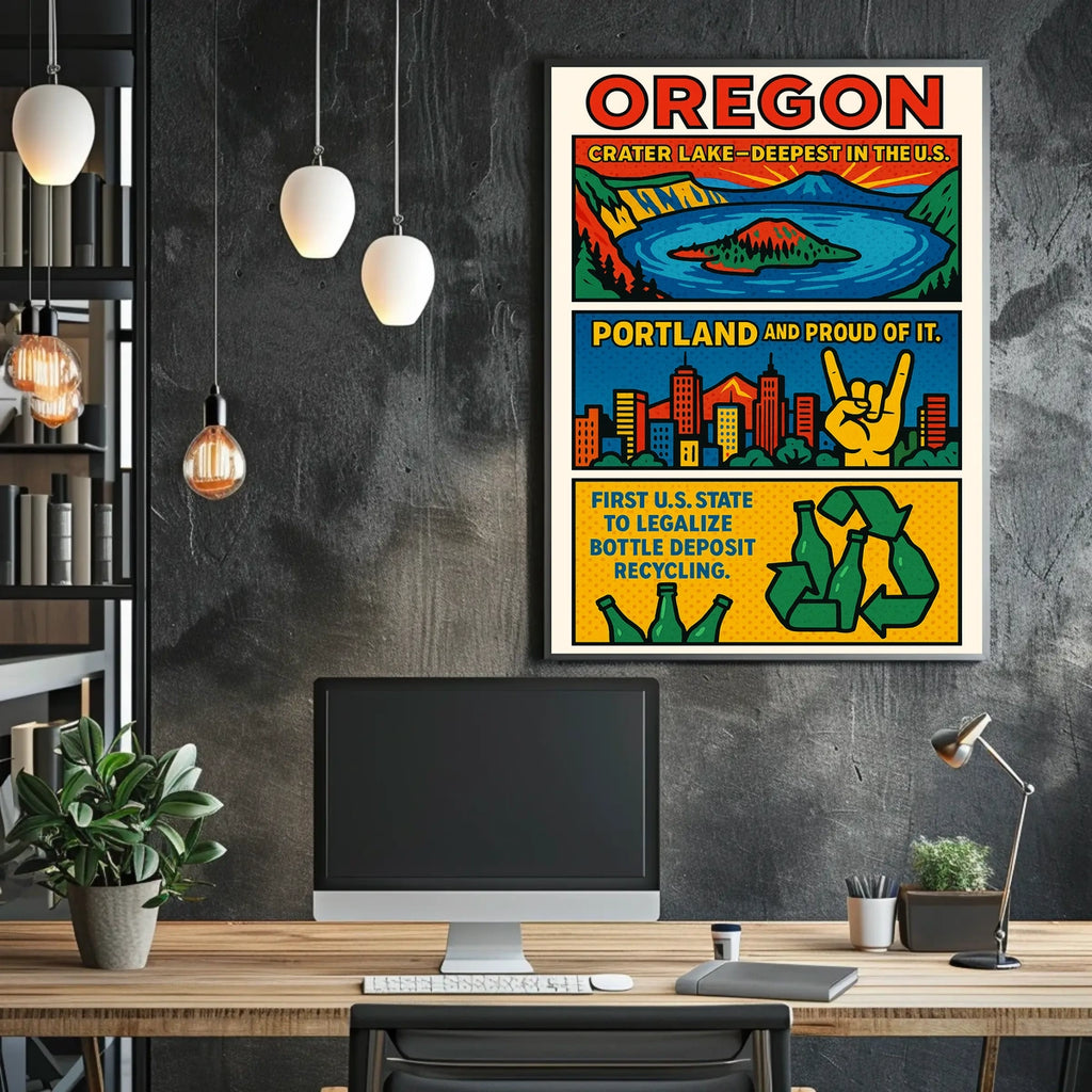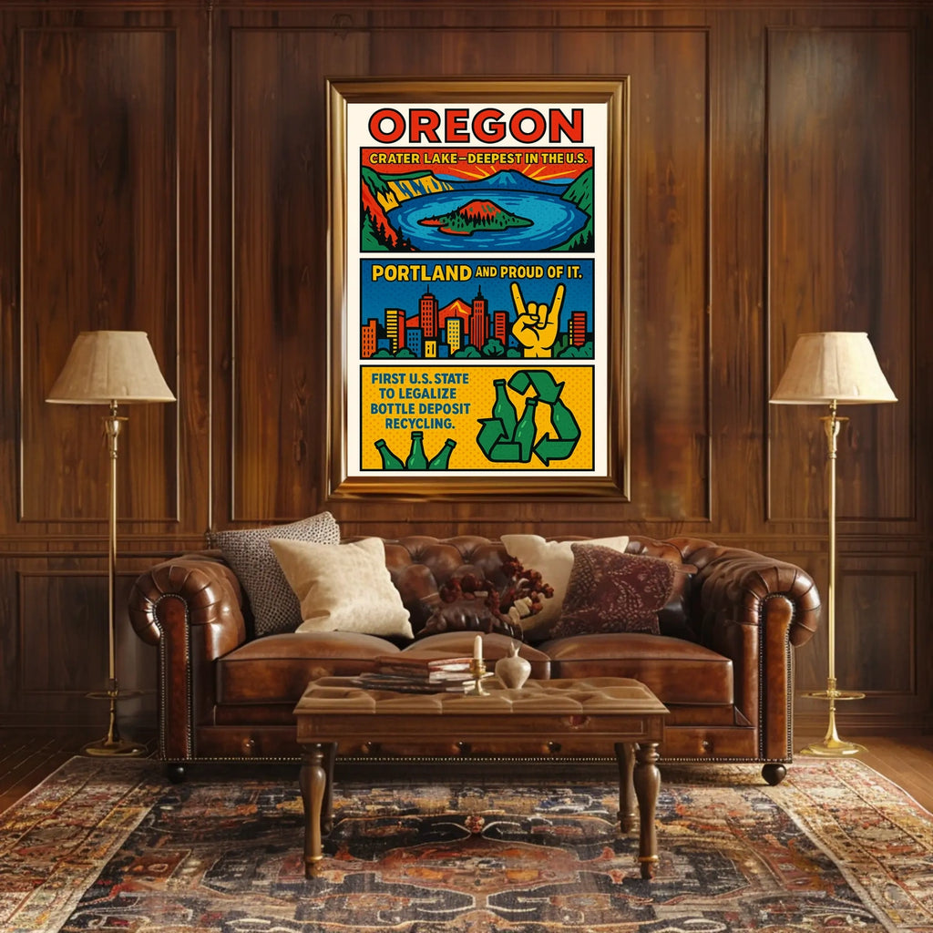 Intro: This poster celebrates Oregon's pioneering bottle deposit recycling, blending retro charm with modern décor. It appeals to travelers, eco enthusiasts, and anyone who loves scenic wall art that tells a story about responsible stewardship of nature.