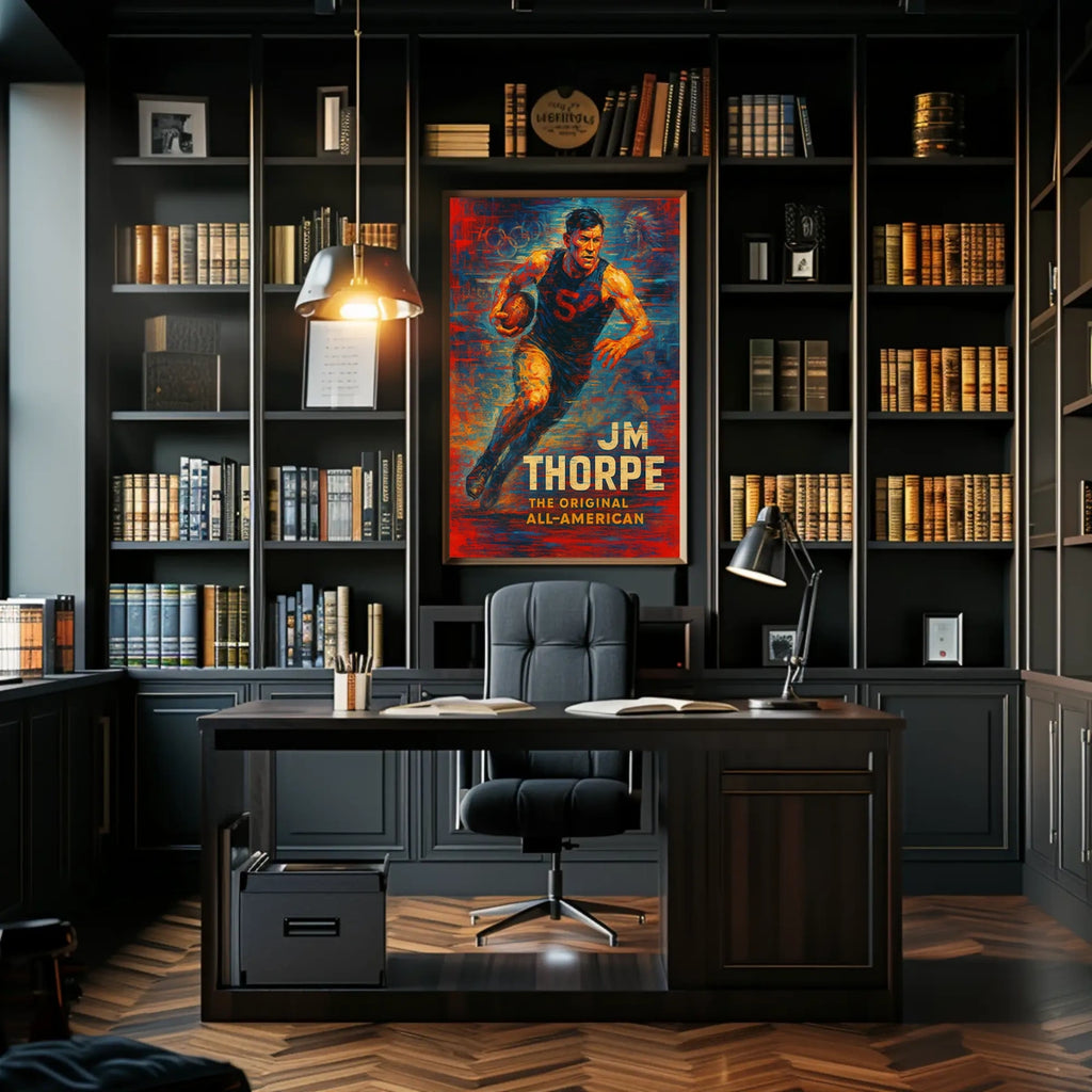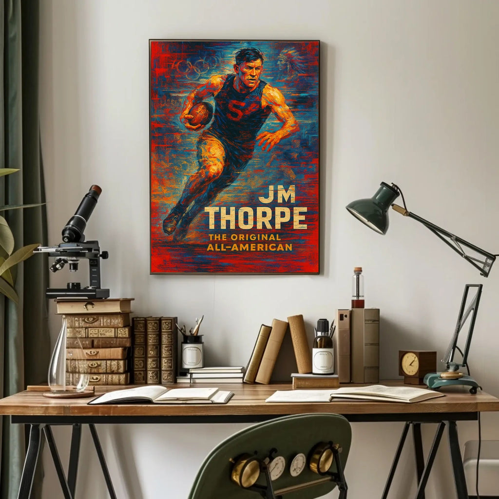 Celebrate the legendary Jim Thorpe with this vibrant poster that captures his boundless energy, determination, and pioneering spirit. Bold colors and energetic brushstrokes bring his iconic athleticism to life, turning any wall into a tribute to a true sports icon.