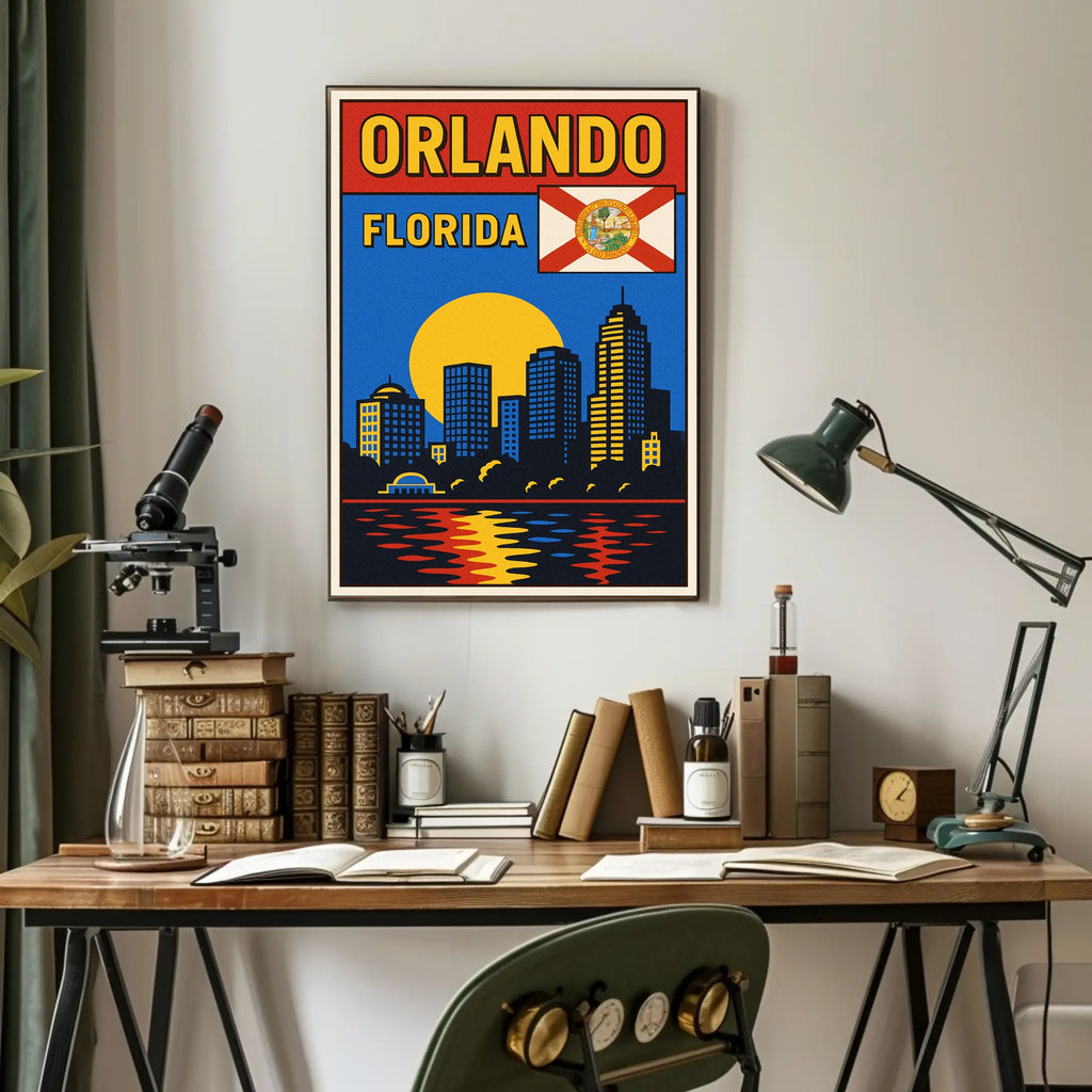 Standout design: Large "ORLANDO" and "FLORIDA" lettering, a stylized Florida flag, and crisp geometric buildings deliver instant visual impact.