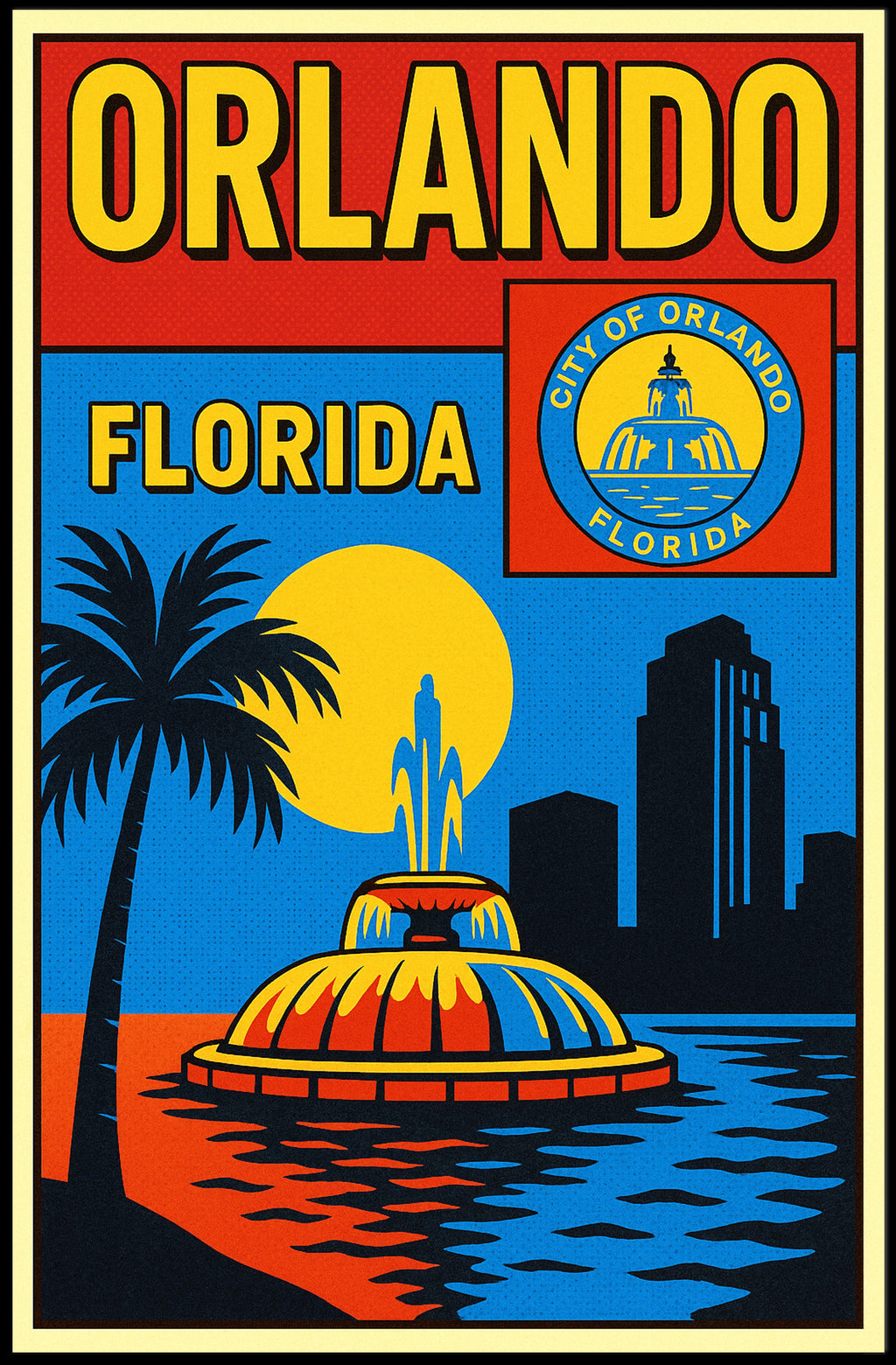 This vibrant Orlando poster is an instant focal point and conversation starter — add a burst of Florida flair to your decor today. Order now from PosterGoat and elevate your space with a colorful tribute to Orlando.